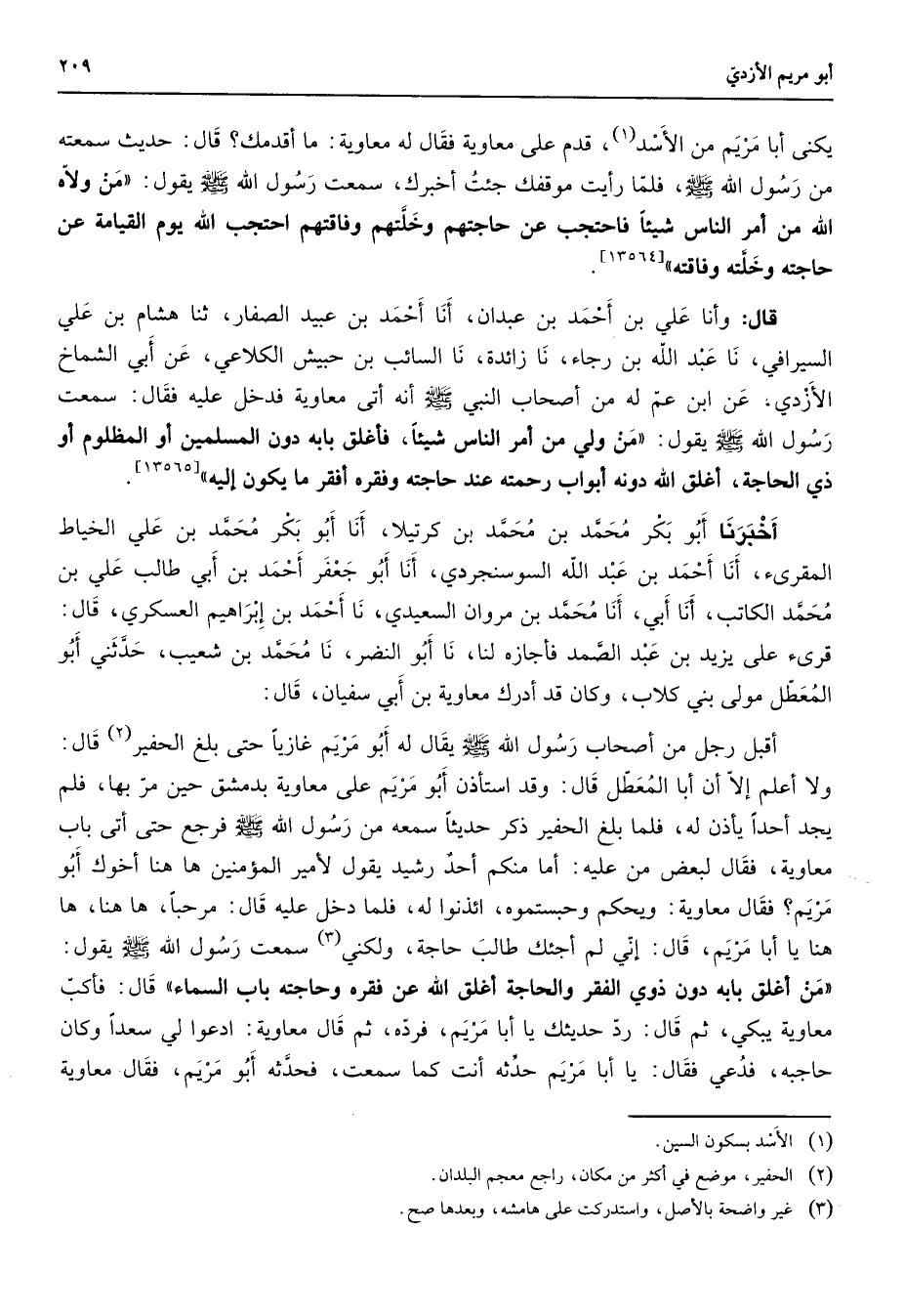 يكنى أبا مريم من الأسد (1) قدم على معاوية فقال له معاوية ما أقدمك قال حديث سمعته من رسول الله (صلى الله عليه وسلم) فلما رايت موقفك جئت أخبرك سمعت رسول الله (صلى الله عليه وسلم) يقول من ولاه الله من امر الناس شيئا فاحتجب عن حاجتهم وخلتهم وفاقتهم احتجب الله يوم القيامة عن حاجته وخلته وفاقته قال وأنا علي بن أحمد بن عبدان أنا أحمد بن عبيد الصفار ثنا هشام بن علي السيرافي نا عبد الله بن رجاء نا زائدة نا السائب بن حبيش الكلاعي عن أبي الشماخ الأزدي عن ابن عم له من أصحاب النبي (صلى الله عليه وسلم) أنه أتى معاوية فدخل عليه فقال سمعت رسول الله (صلى الله عليه وسلم) يقول من ولي من أمر الناس شيئا فأغلق بابه دون المسلمين أو المظلوم أو ذي الحاجة أغلق الله دونه أبواب رحمته عند حاجته وفقره أفقر ما يكون إليه أخبرنا أبو بكر محمد بن محمد بن كرتيلا أنا أبو بكر بن علي الخياط المقرئ أنا أحمد بن عبد الله السوسنجردي أنا أبو جعفر أحمد بن أبي طالب علي بن محمد بن الكاتب أنا أبي أنا محمد محمد بن مروان السعيدي نا أحمد بن إبراهيم العسكري قال قرئ على يزيد بن عبد الصمد فأجازه لنا نا أبو النضر نا محمد بن شعيب حدثني أبو المعطل مولى بني كلاب وكان قد ادرك معاوية بن أبي سفيان قال أقبل رجل من أصحاب رسول الله (صلى الله عليه وسلم) يقال له أبو مريم غازيا حتى بلغ الحفير (2) قال ولا أعلم إلا أن أبا المعطل قال وقد استأذن أبو مريم على معاوية بدمشق حين مر بها فلم يجد أحدا يأذن له بلغ الحفير ذكر حديثا سمعه من رسول (صلى الله عليه وسلم) فرجع حتى أتي باب معاوية فقال لبعض من عليه أما منكم أحد رشيد يقول لأمير المؤمنين ها هنا أخوك أبو مريم فقال معاوية ويحكم وحبستموه ائذنوا له فلما دخل عليه قال مرحبا ها هنا ها هنا يا أبا مريم قال إني لم أجئك طالب حاجة ولكني (3) سمعت رسول الله (صلى الله عليه وسلم) يقول من أغلق بابه دون ذوي الفقر والحاجة أغلق الله عن فقره وحاجته باب السماء قال فأكب معاوية يبكي ثم قال رد حديثك يا أبا مريم فرده ثم قال معاوية ادعوا لي سعدا وكان حاجبه فدعي فقال يا أبا مريم حدثه أنت كما سمعت فحدثه أبو مريم فقال معاوية