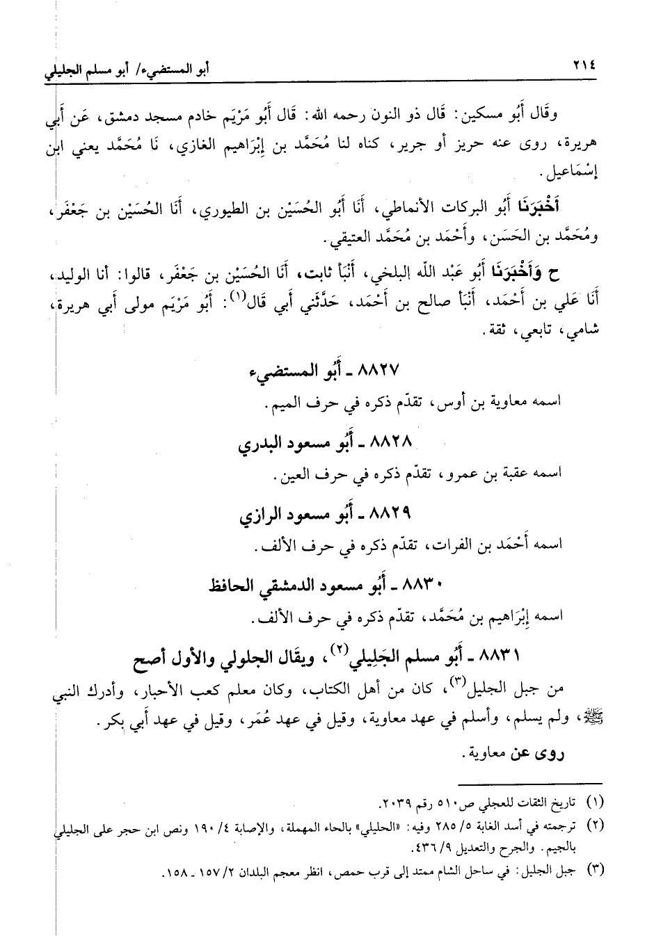 8831 - أبو مسلم الجليلي (2) ويقال الجلولى والأول أصح من جبل الجليل (3) كان من أهل الكتاب وكان معلم كعب الأحبار وأدرك النبي (صلى الله عليه وسلم) ولم يسلم وأسلم في عهد معاوية وقيل في عهد عمر وقيل في عهد أبي بكر روى عن معاوية