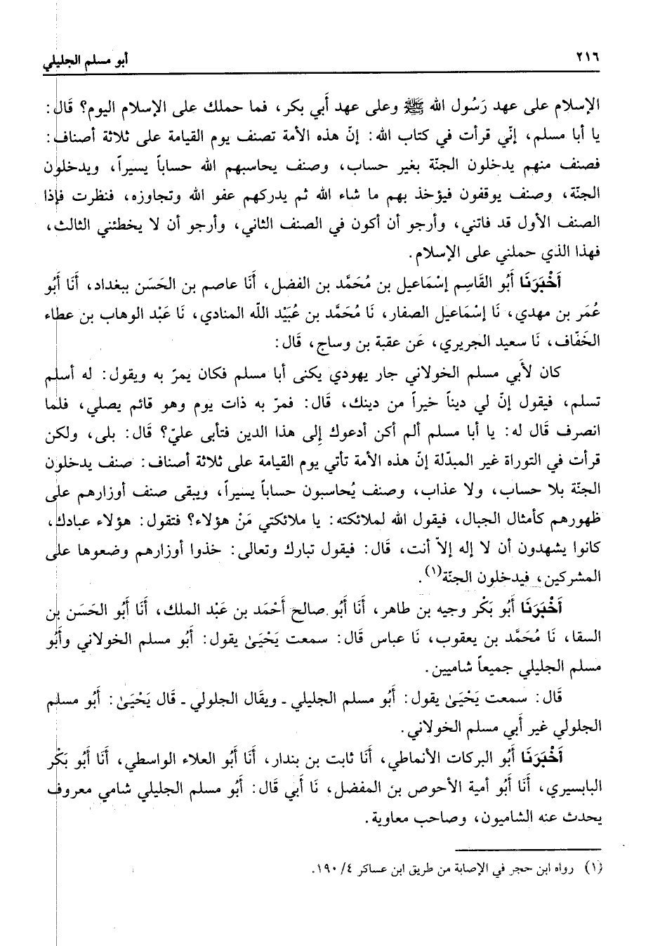 الإسلام على عهد رسول الله (صلى الله عليه وسلم) وعلى عهد أبي بكر فما حملك على الإسلام اليوم قال يا أبا مسلم إني قرأت في كتاب الله إن هذه الأمة تصنف يوم القيامة على ثلاثة أصناف فصنف منهم يدخلون الجنة بغير حساب وصنف يحاسبهم الله حسابا يسيرا ويدخلون الجنة وصنف يوقفون فيؤخذ بهم ما شاء الله ثم يدركهم عفو الله وتجاوزه فنظرت فإذا الصنف الأول قد فاتني وأرجو أن أكون في الصنف الثاني وأرجو أن لا يخطئنى الثالث فهذا الذي حملني على الإسلام أخبرنا أبو القاسم إسماعيل بن محمد بن الفضل أنا عاصم بن الحسن ببغداد أنا أبو عمر بن مهدى نا إسماعيل الصفار نا محمد بن عبيد الله المنادى نا عبد الوهاب بن عطاء الخفاف نا سعيد الجريرى عن عقبة بن وساج قال كان لأبي مسلم الخولاني جار يهودي يكنى أبا مسلم فكان يمر به ويقول له أسلم تسلم فيقول إن لي دينا خيرا من دينك قال فمر به ذات يوم وهو قائم يصلي فلما انصرف قال له يا أبا مسلم ألم أكن أدعوك إلى هذا الدين فتأبى علي قال بلى ولكن قرأت في التوراة غير المبدلة إن هذه الأمة تأتي يوم القيامة على ثلاثة أصناف صنف يدخلون الجنة بلا حساب ولا عذاب وصنف يحاسبون حسابا يسيرا ويبقي صنف أوزارهم على ظهورهم كأمثال الجبال فيقول الله لملائكته يا ملائكتي من هؤلاء فتقول هؤلاء عبادك كانوا يشهدون أن لا إله إلا أنت قال فيقول تبارك وتعالى خذوا أوزارهم وضعوها على المشركين فيدخلون الجنة (1) أخبرنا أبو بكر وجيه بن طاهر أنا أبو صالح أحمد بن عبد الملك أنا أبو الحسن بن السقالا نا محمد بن يعقوب نا عباس قال سمعت يحيى يقول أبو مسلم الخولاني وأبو مسلم الجليلى جميعا شاميين قال سمعت يحيى يقول أبو مسلم الجليلى ويقال الجلولي قال يحيى أبو مسلم الجلولى غير أبي مسلم الخولاني أخبرنا أبو البركات الأنماطي أنا ثابت بن بندار أنا أبو العلاء الواسطي أنا أبو بكر البابسيري أنا أبو أمية الأحوص بن المفضل نا أبي قال أبو مسلم الجليلى شامي معروف يحدث عنه الشاميون وصاحب معاوية