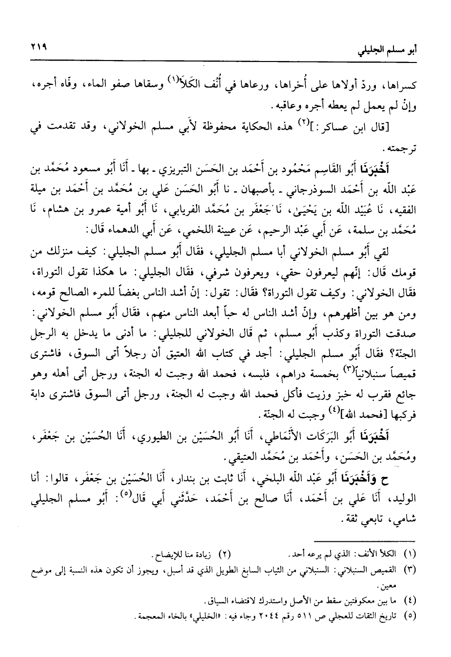 كسراها ورد أولاها على أخراها ورعاها في أنف الكلأ (1) وسقاها صفو الماء وفاه أجره وإن لم يعمل لم يعطه أجره وعاقبه قال ابن عساكر (2) هذه الحكاية محفوظة لأبي مسلم الخولاني وقد تقدمت في ترجمته أخبرنا أبو القاسم محمود بن الحسن التبريزي بها أنا أبو مسعود محمد بن عبد الله بن أحمد السوذرجاني بأصبهان نا أبو الحسن علي بن محمد بن أحمد بن ميلة الفقيه نا عبيد الله بن يحيى نا جعفر بن محمد الفريابي نا أبو أمية عمرو بن هشام نا محمد بن سلمة عن أبي عبد الرحيم عن عيينة اللخمي عن أبي الدهماء قال لقي أبو مسلم الخولاني أبا مسلم الجليلي فقال أبو مسلم الجليلي كيف منزلك من قومك قال إنهم ليعرفون حقي ويعرفون شرفي فقا ل الجليلي ما هكذا تقول التوراة فقال الخولاني وكيف تقول التوراة فقال تقول إن أشد الناس بغضا للمرء الصالح فقومه ومن بين أظهرهم وإن أشد الناس له حبا أبعد الناس منهم فقال أبو مسلم الخولاني صدقت التوراة وكذب أبو مسلم ثم قال الخولاني للجليلي ما أدني ما يدخل به الرجل الجنة فقال أبو مسلم الجليلي أجد في كتاب الله العتيق أن رجلا أتي السوق فاشترى قميصا سنبلانيا (3) بخمسة دراهم فلبسه فحمد الله وجبت له الجنة ورجل أتي أهله وهو جائع فقرب له خبز وزيت فأكل فحمد الله وجبت له الجنة ورجل أتى السوق فاشترى دابة فركبها فحمد الله (4) وجبت له الجنة أخبرنا أبو البركات الأنماطي أنا أبو الحسين بن الطيورى أنا الحسين بن جعفر ومحمد بن الحسين وأحمد بن محمد العتيقي ح وأخبرنا أبو عبد الله البلخي أنا ثابت بن بندار أنا الحسين بن جعفر قالوا أنا الوليد أنا علي بن أحمد أنا صالح بن أحمد حدثني أبي (5) قال أبو مسلم الجليلي شامي تابعي ثقة
