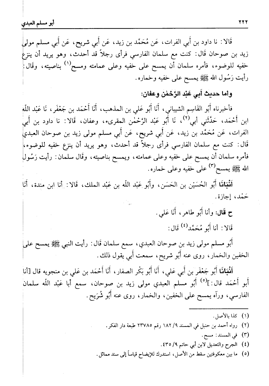 قالا نا داود بن أبي الفرات عن محمد بن زيد عن أبي شريح عن أبي مسلم مولى زيد بن صوحان قال كنت مع سلمان الفارسي فرأى رجلا قد أحدث وهو يريد أن ينزع خفية للوضوء فأمره سلمان أن يمسح على خفيه وعلى عمامته ومسح (1) بناصيته وقال رأيت رسول الله (صلى الله عليه وسلم) يمسح على خفيه وخماره وأما حديث أبي عبد الرحمن وعفان فأخبرناه أبو القاسم الشيباني أنا أبو علي بن المذهب أنا أحمد بن جعفر نا عبد الله ابن أحمد حدثني أبي (2) نا أبو عبد الرحمن المقرئ وعفان قالا نا داود بن أبي الفرات عن محمد بن زيد عن أبي شريح عن أبي مسلم مولى زيد بن صوحان العبدى قال كنت مع سلمان الفارسي فرأى رجلا قد أحدث وهو يريد أن ينزع خفيه للوضوء فأمره سلمان أن يمسح على خفيه وعلى عمامته ويمسح بناصيته وقال سلمان رأيت رسول الله (صلى الله عليه وسلم) يمسح (3) على خفيه وعلى خماره أنبأنا أبو الحسين بن الحسن وأبو عبد الله بن عبد الملك قالا أنا ابن منده أنا حمد إجازة ح قال وأنا أبو طاهر أنا علي قالا أنا أبو محمد (4) قال أبو مسلم مولى زيد بن صوحان العبدي سمع سلمان قال رأيت النبي (صلى الله عليه وسلم) يمسح على الخفين والخمار روى عنه أبو شريح سمعت أبي يقول ذلك أنبأنا أبو جعفر بن أبي علي أنا أبو بكر الصفار أنا أحمد بن علي بن منجوية قال انا أبو أحمد قال (5) أبو مسلم العبدي مولى زيد بن صوحان سمع عبد الله سلمان الفارسي ورآه يسمح على الخفين والخمار روى عنه أبو شريح