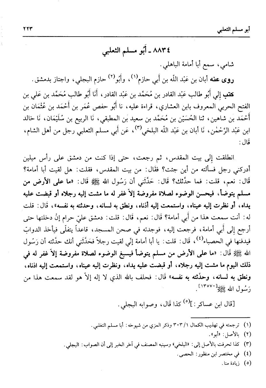 8834 - أبو مسلم الثعلبي شامي سمع أبا أمامة الباهلي روى عنه أبان بن عبد الله بن أبي حازم (1) وأبو (2) حازم البجلي واجتاز بدمشق كتب إلي أبو طالب عبد القادر بن محمد بن عبد القادر أنا أبو طالب محمد بن علي بن الفتح الحربي المعروف بابن العشاري قراءة عليه نا أبو حفص عمر بن أحمد بن عثمان بن أحمد بن شاهين ثنا الحسين بن محمد بن سعيد بن المطبقي نا الربيع بن سليمان نا خالد ابن عبد الرحمن نا أبان بن عبد الله البلخي (3) عن أبي مسلم الثعلبي رجل من أهل الشام قال انطلقت إلى بيت المقدس ثم رجعت حتى إذا كنت من دمشق على رأس ميلين أدركني رجل فسألته من أين جئت فقال من بيت المقدس فقلت هل لقيت أبا أمامة قال نعم قلت فما حدثك قال حدثني أن رسول الله (صلى الله عليه وسلم) قال ما على الأرض من مسلم يتوضأ فيحسن الوضوء لصلاة مفروضة إلا غفر له ما مشت إليه رجلاه أو قبضت عليه يداه أو نظرت إليه عيناه واستمعت إليه اذناه ونطق به لسانه وحدثته به نفسه قال قلت له أنت سمعت هذا من أبي أمامة قال نعم قال قلت دمشق على حرام إن دخلتها حتى أرجع إلى أبي أمامة فرجعت إليه فوجدته في صحن المسجد قاعدا يتفلى فيأخذ الدواب فيدفنها في الحصباء (4) قال قلت يا أبا أمامة إني لقيت رجلا فحدثني أنك حدثته أن رسول الله (صلى الله عليه وسلم) قال ما على الأرض من مسلم يتوضأ فيسبغ الوضوء لصلاة مفروضة إلا غفر له في ذلك اليوم ما مشت إليه رجلاه أو قبضت عليه يداه ونظرت إليه عيناه واستمعت إليه أذناه ونطق به لسانه وحدثته به نفسه قال فحلف بالله الذي لا إله إلا هو لقد سمعت هذا من رسول الله (صلى الله عليه وسلم) قال ابن عساكر (5) كذا قال وصوابه البجلى