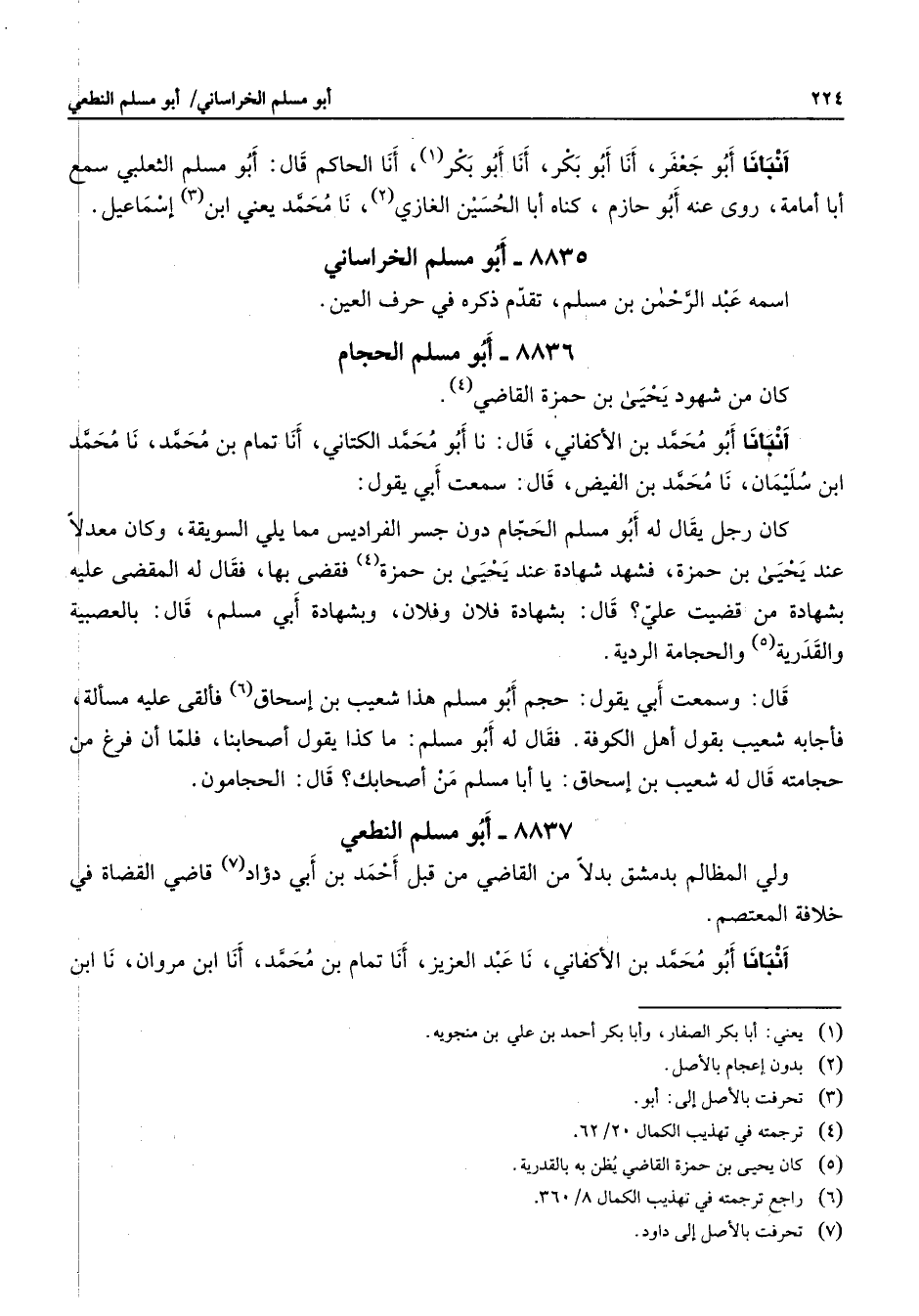 8837 - أبو مسلم النطعي ولى المظالم بدمشق بدلا من القاضي من قبل أحمد بن أبي دؤاد (7) قاضي القضاة في خلافة المعتصم أنبأنا أبو محمد بن الأكفاني نا عبد العزيز أنا تمام بن محمد أنا ابن مروان نا ابن