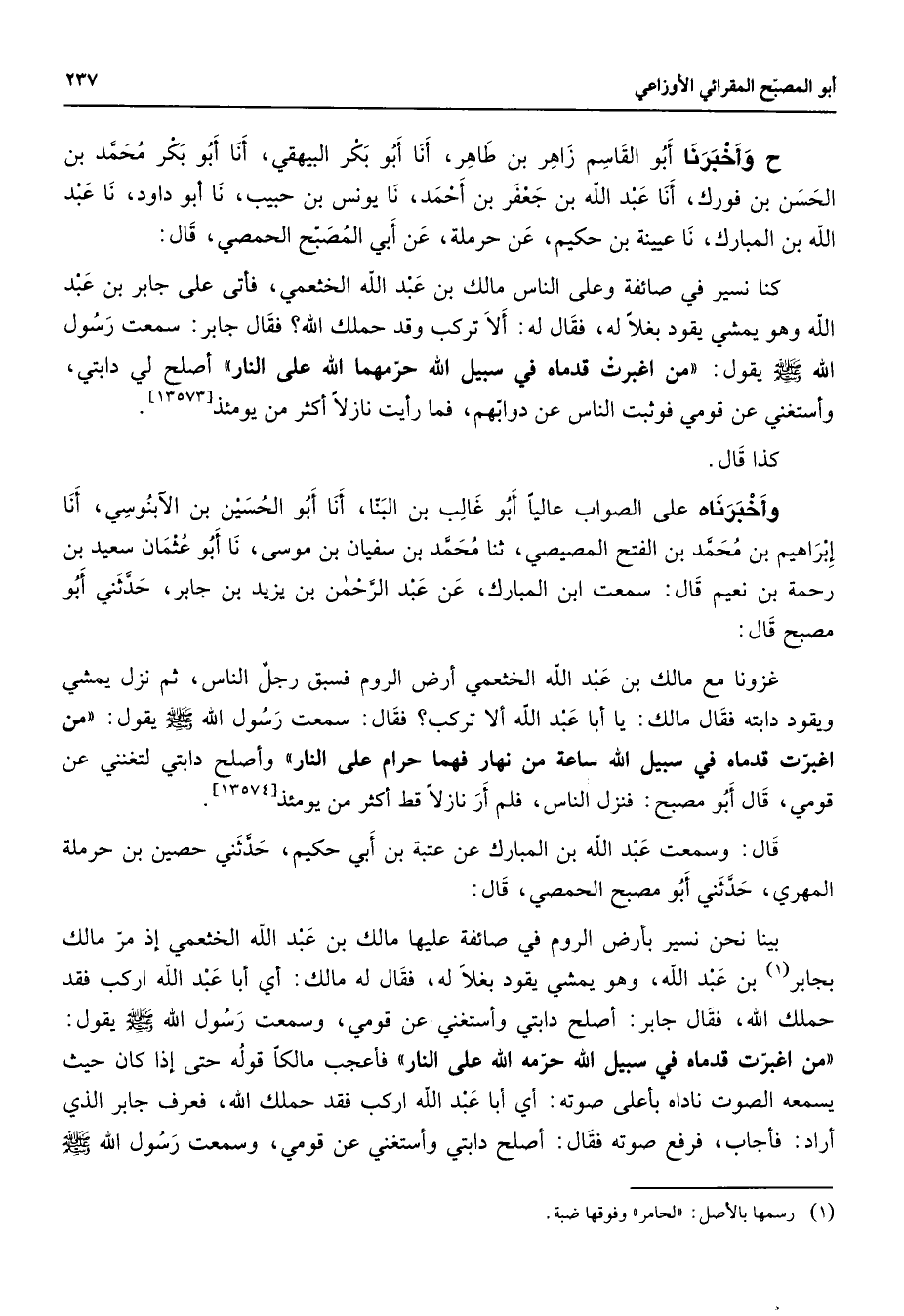 ح وأخبرنا أبو القاسم زاهر بن طاهر أنا أبو بكر البيهقي أنا أبو بكر محمد بن الحسن بن فورك أنا عبد الله بن جعفر بن أحمد نا يونس بن حبيب نا أبو داود نا عبد الله بن المبارك نا عيينة بن حكيم عن حرملة عن أبي المصبح الحمصي قال كنا نسير في صائفة وعلى الناس مالك بن عبد الله الخثعمي فأتي على جابر بن عبد الله وهو يمشي يقود بغلا له فقال له ألا تركب وقد حملك الله فقال جابر سمعت رسول الله (صلى الله عليه وسلم) يقول من اغبرت قدماه في سبيل الله حرمهما الله على النار أصلح لي دابتي وأستغني عن قومي فوثبت الناس عن دوابهم فما رأيت نازلا أكثر من يومئذ كذا قال وأخبرناه على الصواب عاليا أبو غالب بن البنا أنا أبو الحسين بن الآنبوسي أنا إبراهيم بن محمد بن الفتح المصيصي ثنا محمد بن سفيان بن موسى نا أبو عثمان سعيد بن رحمة بن نعيم قال سمعت ابن مبارك عن عبد الرحمن بن يزيد بن جابر حدثني أبو مصبح قال غزونا مع مالك بن عبد الله الخثعمي أرض الروم فسبق رجل الناس ثم نزل يمشي ويقود دابته فقال مالك يا أبا عبد الله ألا تركب فقال سمعت رسول الله (صلى الله عليه وسلم) يقول من اغبرت قدماه في سبيل الله ساعة من نهار فهما حرام على النار وأصلح دابتي لتغنني عن قومي قال أبو مصبح فنزل الناس فلم أر نازلا قط أكثر من يومئذ قال وسمعت عبد الله بن المبارك عن عتبة بن أبي حكيم حدثني حصين بن حرملة المهري حدثني أبو مصبح الحمصي قال بينا نحنى نسير بأرض الروم في صائفة عليها مالك بن عبد الله الخثعمي إذ مر مالك بجابر (1) بن عبد الله وهو يمشي يقود بغلا لهه فقال له مالك أي أبا عبد الله اركب فقد حملك الله فقال جابر أصلح دابتي ولأستغني عن قومي وسمعت رسول الله (صلى الله عليه وسلم) يقول من اغبرت قدماه في سبيل الله حرمه الله على النار فأعجب مالكا قوله حتى إذا كان حيث يسمعه الصوت ناداه بأعلى صوته أي أبا عبد الله اركب فقد حملك الله فعرف جابر الذي أراد فأجاب فرفع صوته فقال أصلح دابتي وأستغني عن قومي وسمعت رسول الله (صلى الله عليه وسلم)