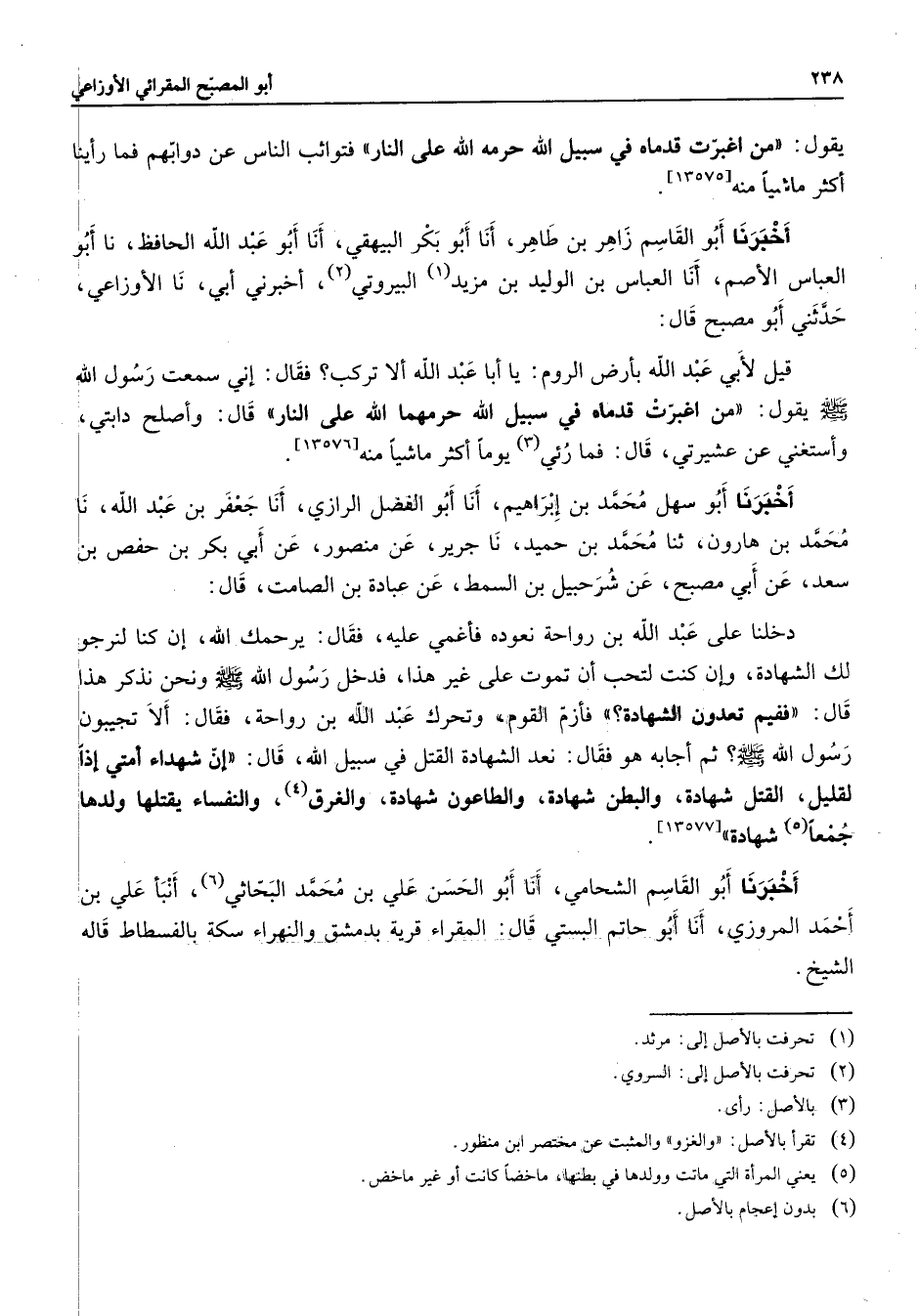يقول من اغبرت قدماه في سبيل الله حرمه الله على النار فتواثب الناس عن دوابهم فما رأينا أكثر ماشيا منه أخبرنا أبو القاسم زاهر بن طاهر أنا أبو بكر البيهقي أنا أبو عبد الله الحافظ نا أو العباس الأصم أنا العباس بن الوليد بن مزيد (1) البيروني (2) أخبرني أبي نا الأوزاعي حدثني أبو مصبح قال قيل لأبي عبد الله بأرض الروم يا أبا عبد الله ألا تركب فقال إني سمعت رسول الله (صلى الله عليه وسلم) يقول من اغبرت قدماه في سبيل الله حرمهما الله على النار قال وأصلح دابتي وأستغني عن عشيرتي قال فما رئي (3) يوما أكثر ماشيا منه أخبرنا أبو سهل محمد بن إبراهيم أنا أبو الفضل الرازي أنا جعفر بن عبد الله نا محمد بن هارون ثنا محمد بن حميد نا جرير عن منصور عن أبي بكر بن حفص بن سعد عن أبي مصبح عن شرحبيل بن السمط عن عبادة بن الصامت قال دخلنا على عبد الله بن رواحة نعوده فأغمي عليه فقال يرحمك الله إن كنا لنرجو لك الشهادة وإن كنت لتحب أن تموت على غير هذا فدخل رسول الله (صلى الله عليه وسلم) ونحن نذكر هذا قال ففيم تعدون الشهادة فأزم القوم وتحرك عبد الله بن رواحة فقال ألا تجيبون رسول الله الله (صلى الله عليه وسلم) ثم أجابه هو فقال نعد الشهادة القتل في سبيل الله قال إن شهداء أمتي إذا لقليل القتل شهادة والبطن شهادة والطاعون شهادة والغرق (4) والنفساء يقتلها ولدها جمعا (5) شهادة أخبرنا أبو القاسم الشحامي أنا أبو الحسن علي بن محمد البحاثي (6) أنبأ علي بن أحمد المروزى أنا أبو حاتم البستي قال المقراء قرية بدمشق والنهراء سكة بالفسطاط قاله الشيخ