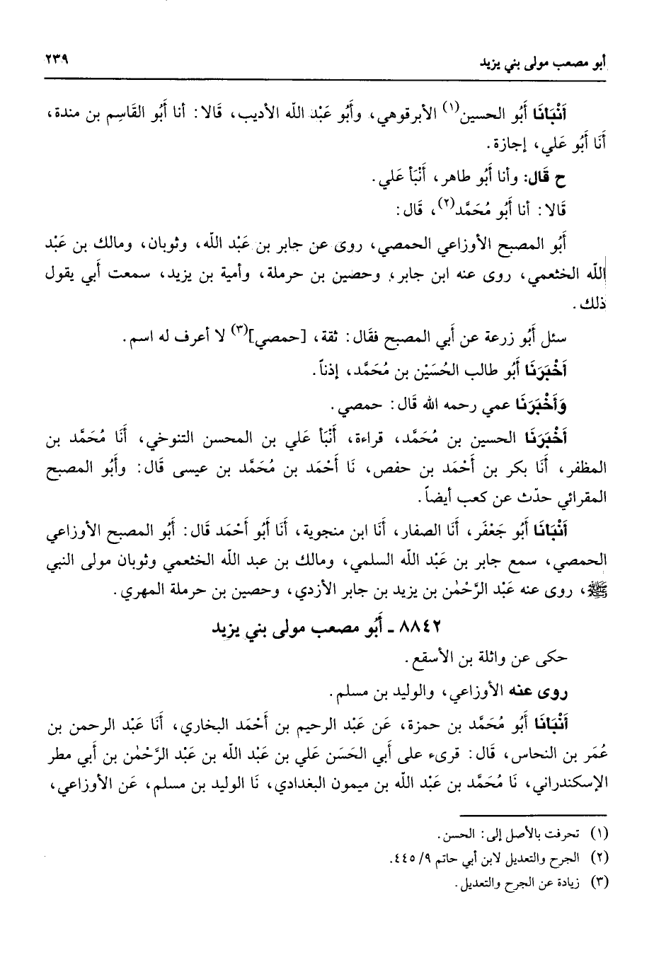 أنبأنا أبو الحسين (1) الأبرقوهي وأبو عبد الله الأديب قالا أنا أبو القاسم بن مندة أنا أبو علي إجازة ح قال وانا أبو طاهر أنبأ علي قالا أنا أبو محمد (2) قال أبو المصبح الأوزاعي الحمصي روى عن جابر بن عبد الله وثوبان ومالك بن عبد الله الخثعمي روى عنه ابن جابر وحصين بن حرملة وأمية بن يزيد سمعت أبي يقول ذلك سئل أبو زرعة عن أبي المصبح فقال ثقة حمصي (3) لا أعرف له اسم أخبرنا أبو طالب الحسين بن محمد إذنا وأخبرنا عمي رحمه الله قال حمصي اخبرنا الحسين بن محمد قراءة أنبأ علي بن المحسن التنوخي أنا محمد بن المظفر أنا أبو بكر بن أحمد بن حفص نا أحمد بن محمد بن عيسى قال وأبو المصبح المقرائى حدث عن كعب أيضا أنبأنا أبو جعفر أنا الصفار أنا ابن منجوية أنا أبو أحمد قال أبو المصبح الأوزاعي الحمصي سمع جابر بن عبد الله السلمي ومالك بن عبد الله الخثعمي وثوبان مولى النبي (صلى الله عليه وسلم) روى عنه عبد الرحمن بن يزيد بن جابر الأزدي وحصين بن حرملة المهرى
