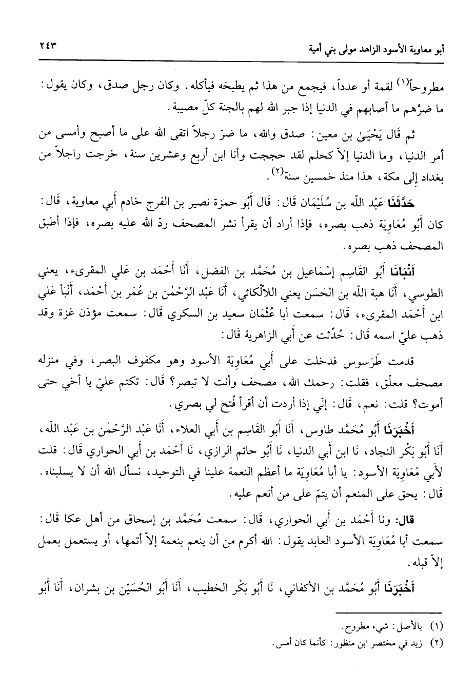 مطروحا (1) لقمة أو عددا فيجمع من هذا ثم يطبخه لا فيأكله وكان رجل صدق وكان يقول ما ضرهم ما أصابهم في الدنيا إذا جبر الله لهم بالجنة كل مصيبة ثم قال يحيى بن معين صدق والله ما ضر رجلا اتقي الله على ما أصبح وأمسى من أمر الدنيا وما الدنيا إلا كحلم لقد حججت وأنا ابن أربع وعشرين سنة خرجت راجلا من بغداد إلى مكة هذا منذ خمسين سنة (2) حدثنا عبد الله بن سليمان قال قال أبو حمزة نصير بن الفرج خادم أبي معاوية قال كان أبو معاوية ذهب بصره فإذا أراد أن يقرأ نشر المصحف رد الله عليه بصره فإذا أطبق المصحف ذهب بصره أنبأنا أبو القاسم إسماعيل بن محمد بن الفضل أنا أحمد بن علي المقرئ يعني الطوسي أنا هبة الله بن الحسن يعني اللالكائي أنا عبد الرحمن بن عمر بن أحمد أنبأ علي ابن أحمد المقرئ قال سمعت أبا عثمان سعيد بن السكري قال سمعت مؤذن غزة وقد ذهب على اسمه قال حدثت عن أبي الزاهرية قال قدمت طرسوس فدخلت على أبي معاوية الأسود وهو مكفوف البصر وفي منزله مصحف معلق فقلت رحمك الله مصحف وأنت لا تبصر قال تكتم علي يا أخي حتى أموت قلت نعم قال إني إذا أردت أن أقرأ فتح لي بصري أخبرنا أبو محمد طاوس أنا أبو القاسم بن أبي العلاء أنا عبد الرحمن بن عبد الله أنا أبو بكر النجاد نا ابن أبي الدنيا نا أبو حاتم الرازي نا أحمد بن أبي الحوارى قال قلت لأبي معاوية الأسود يا أبا معاوية ما أعظم النعمة علينا في التوحيد نسأل الله أن لا يسلبناه قال يحق على المنعم أن يتم على من أنعم عليه قال ونا أحمد بن أبي الحوارى قال سمعت محمد بن إسحاق من أهل عكا قال سمعت أبا معاوية الأسود العابد يقول الله أكرم من أن ينعم بنعمة إلا أتمها أو يستعمل بعمل إلا قبله أخبرنا أبو محمد بن الأكفاني نا أبو بكر الخطيب أنا أبو الحسين بن بشران أنا أبو