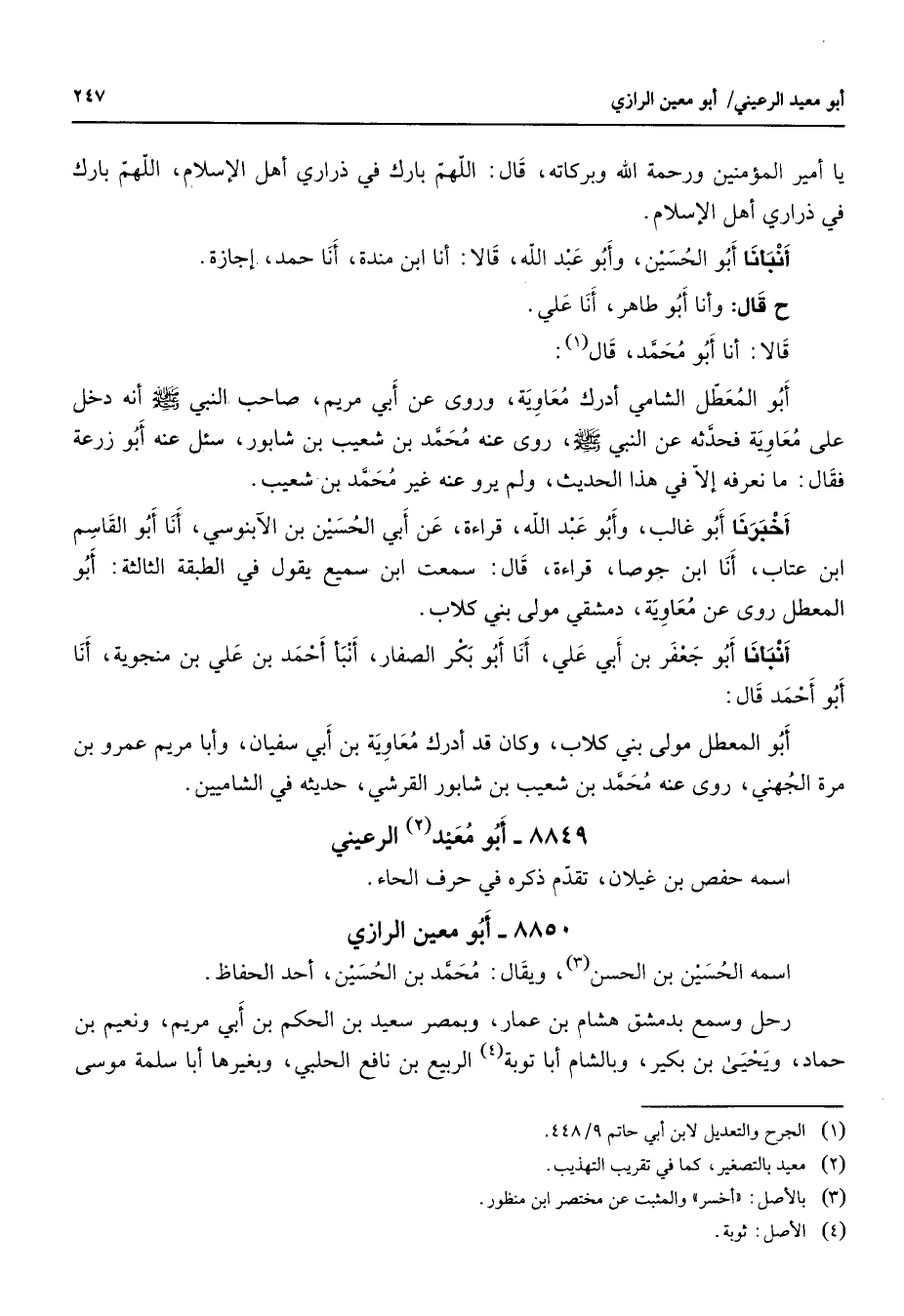 يا أمير المؤمنين ورحمة الله وبركاته قال اللهم بارك في ذرارى أهل الاسلام اللهم بارك في ذرارى أهل الأسلام أنبأنا أبو الحسين وأبو عبد الله قالا أنا ابن مندة أنا حمد إجازة ح قال وأنا أبو طاهر أنا علي قالا أنا أبو محمد قال (1) أبو المعطل الشامي أدرك معاوية وروى عن أبي مريم صاحب النبي (صلى الله عليه وسلم) أنه دخل على معاوية فحدثه عن النبي (صلى الله عليه وسلم) روى عنه محمد بن شعيب بن شابور سئل عنه أبو زرعة فقال ما نعرفه إلا في هذا الحديث ولم يرو عنه غير محمد بن شعيب أخبرنا أبو غالب وأبو عبد الله قراءة عن أبي الحسين بن الآبنوسي أنا أبو القاسم ابن عتاب أنا أبن جوصا قراءة قال سمعت ابن سميع يقول في الطبقة الثالثة أبو المعطل روى عن معاوية دمشقي مولى بني كلاب أنبأنا أبو جعفر بن أبي علي أنا أبو بكر الصفار أنبأ أحمد بن علي بن منجوية أنا أبو أحمد قال أبو المعطل مولى بني كلاب وكان قد أدرك معاوية بن أبي سفيان وأبا مريم عمرو بن مرة الجهنى روى عنه محمد بن شعيب بن شابور القرشي حديثه في الشاميين