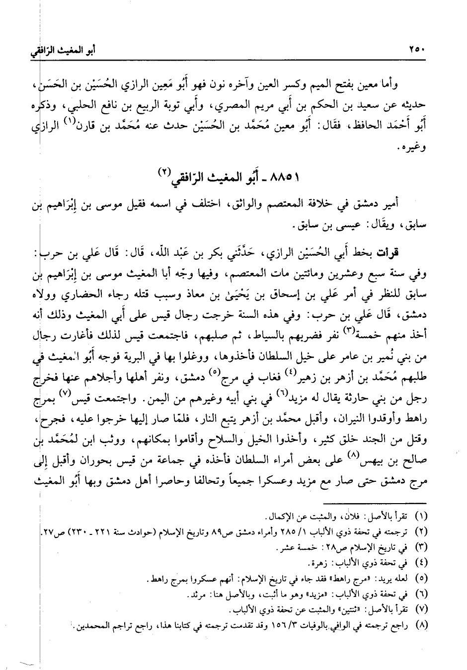 (2) ترجمته في تحفة ذوي الالباب 1 / 285 وأمراء دمشق ص 89 وتاريخ الاسلام (حوادث سنة 221 - 230) ص 27