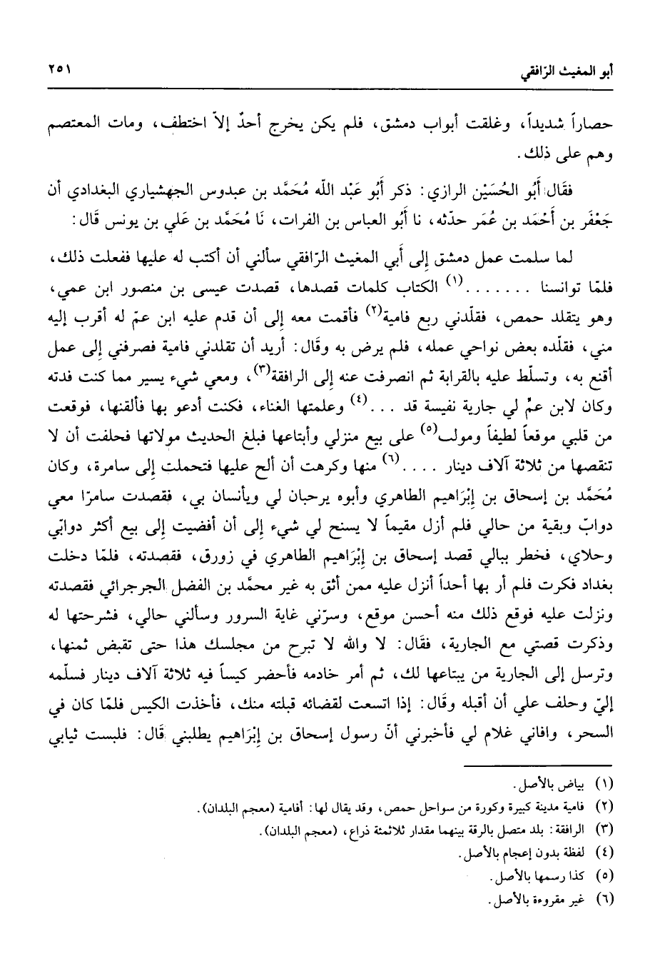 حصارا شديدا وغلقت أبواب دمشق فلم يكن يخرج أحد إلا اختطف ومات المعتصم وهم على ذلك فقال أبو الحسين الرازي ذكر أبو عبد الله محمد بن عبدوس الجهشيارى البغدادي أن جعفر بن أحمد بن عمر حدثه نا أبو العباس بن الفرات نا محمد بن علي بن يونس قال لما سلمت عمل دمشق إلى أبي المغيث الرافقي سألني أن أكتب له عليها ففعلت ذلك فلما توانسنا (1) الكتاب كلمات قصدها قصدت عيسى بن منصور ابن عمي وهو يتقلد حمص فقلدني ربع فامية (2) فأقمت معه إلى أن قدم عليه ابن عم له أقرب إليه مني فقلده بعض نواحي عمله فلم يرض به وقال أريد أن تقلدني فامية فصرفني إلى عمل أقنع به وتسلط عليه بالقرابه ثم انصرفت عنه إلى الرافقة (3) ومعي شئ يسير مما كنت فدته وكان لابن عم لى جارية نفيسة قد (4) وعلمتها الغناء فكنت أدعو بها فألقنها فوقعت من قلبي موقعا لطيفا ومولب (5) على بيع منزلي وأبتاعها فبلغ الحديث مولاتها فحلفت أن لا تنقصها من ثلاثة آلف دينار (6) منها وكرهت أن ألح عليها فتحملت إلى سامرة وكان محمد بن إسحاق بن إبراهيم الطاهري وأبوه يرحبان لي ويأنسان بي فقصدت سامرا معي دواب وبقية من حالي فلم أزل مقيمالا يسنح لي شئ إلى ان أفضيت إلى بيع اكثر دوابي وحلاي فخطر ببالي قصد إسحاق بن ابراهيم الطاهري في زورق فقصدته فلما دخلت بغداد فكرت فلم أر بها أحدا أنزل عليه ممن أثق به غير محمد بن الفضل الجرجاني فقصدته ونزلت عليه فوقع ذلك منه أحسن موقع وسرني غاية السرور وسألني حالي فشرحتها له وذكرت قصتي مع الجارية فقال لا والله لا تبرح من مجلسك هذا حتى تقبض ثمنها وترسل إلى الجارية من يبتاعها لك ثم أمر خادمة فأحضر كيسا فيه ثلاثة آلاف دينار فسلمة إلى وحلف علي أن أقبله وقال إذا اتسعت لقضائه قبلته منك فأخذت الكيس فلما كان في السحر وافاني غلام لي فأخبرني أن رسول إسحاق بن إبراهيم يطلبني قال فلبست ثيابي