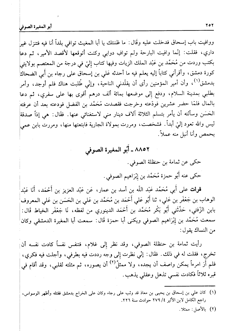 8852 - أبو المغيرة الصوفي حكى عن ثمامة بن حنظلة الصوفي حكى عنه أبو حمزة محمد بن إبراهيم الصوفي قرأت على أبي محمد عبد الله بن أسد بن عمار عن عبد العزيز بن أحمد أنا عبد الوهاب بن جعفر بن علي ثنا أبو علي أحمد بن محمد بن علي بن الحسن بن علي المعروف بابن الزفتي حدثني أبو بكر محمد بن أحمد الدينوري من لفظه نا جعفر الخياط قال سمعت محمد بن إبراهيم الصوفي ويكني أبا حمزة قال سمعت أبا المغيرة الدمشقي وكان من النساك يقول رأيت ثمامة بن حنظلة الصوفي وقد نظر إلى غلام فتنفس نفسا كادت نفسه أن تخرج فقلت له في ذلك فقال إني نظرت إلى وجه رددت فيه بطرفي وأجلت فيه فكرى فلم أر امرءا يمكن واصف أن يجده ولا ممثل (2) أن يصوره ثم مثلته لقلبي وقد أقام في قبره ثلاثا فكادت نفسي تذهل وعقلي يذهب