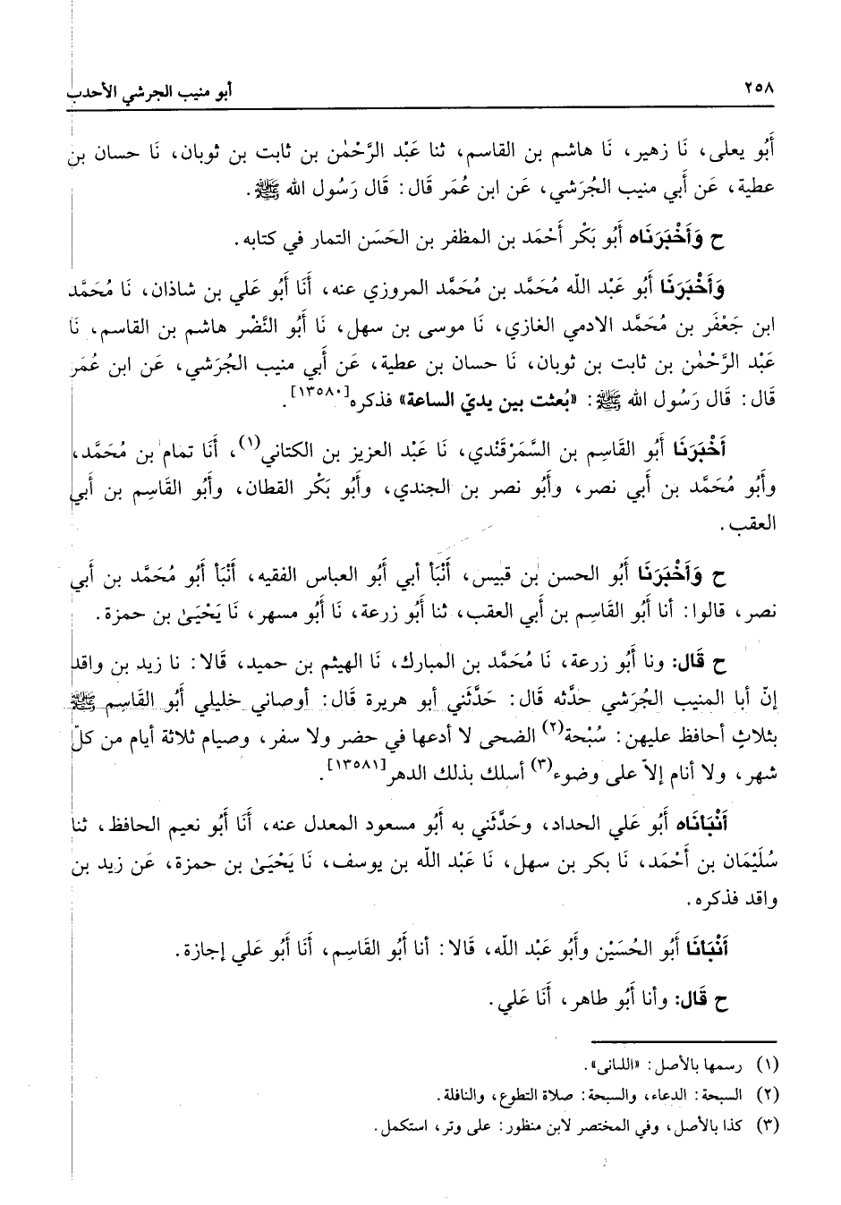أبو يعلي نا زهير نا هاشم بن القاسم ثنا عبد الرحمن بن ثابت بن ثوبان نا حسان بن عطية عن أبي منيب الجرشي عن ابن عمر قال قال رسول الله (صلى الله عليه وسلم) وأخبرناه أبو بكر أحمد بن المظفر بن الحسن التمار في كتابه وأخبرنا أبو عبد الله محمد بن محمد المروزى عنه أنا أبو علي بن شاذان نا محمد ابن جعفر بن محمد الادمى الغازي نا موسى بن سهل نا أبو النضر هاشم بن القاسم نا عبد الرحمن بن ثابت بن ثوبان نا حسان بن عطية عن أبي منيب الجرشي عن ابن عمر قال قال رسول الله (صلى الله عليه وسلم) بعثت بين يدي الساعة فذكره أخبرنا أبو القاسم بن السمرقندي نا عبد العزيز بن الكتاني (1) أنا تمام بن محمد وأبو محمد بن أبي نصر وأبو نصر بن الجندي وأبو بكر القطان وأبو القاسم بن أبي العقب ح وأخبرنا أبو الحسن بن قبيس أنبأ أبي أبو العباس الفقيه أنبأ أبو محمد بن أبي نصر قالوا أنا أبو القاسم بن أبي العقب ثنأ أبو زرعة نا أبو مسهر نا يحيى بن حمزة ح قال ونا أبو زرعة نا محمد بن المبارك نا الهيثم بن حميد قالا نا زيد بن واقد إن أبا المنيب الجرشي حدثه قال حدثني أبو هريرة قال اوصاني خليلي أبو القاسم (صلى الله عليه وسلم) بثلاث أحافظ عليهن سبحة (2) الضحي لا أدعها في حضر ولا سفر وصيام ثلاثة أيام من كل شهر ولا أنام إلا على ضوء (3) أسلك بذلك الدهر أنبأناه أبو علي الحداد وحدثني به أبو مسعود المعدل عنه أنا أبو نعيم الحافظ ثنا سلميان بن أحمد نا بكر بن سهل نا عبد بن يوسف نا يحيى بن حمزة عن زيد بن واقد فذكره أنبأنا أبو الحسين وأبو عبد الله قالا أنا أبو القاسم أنا أبو علي إجازة ح قال وأنا أبو طاهر أنا علي
