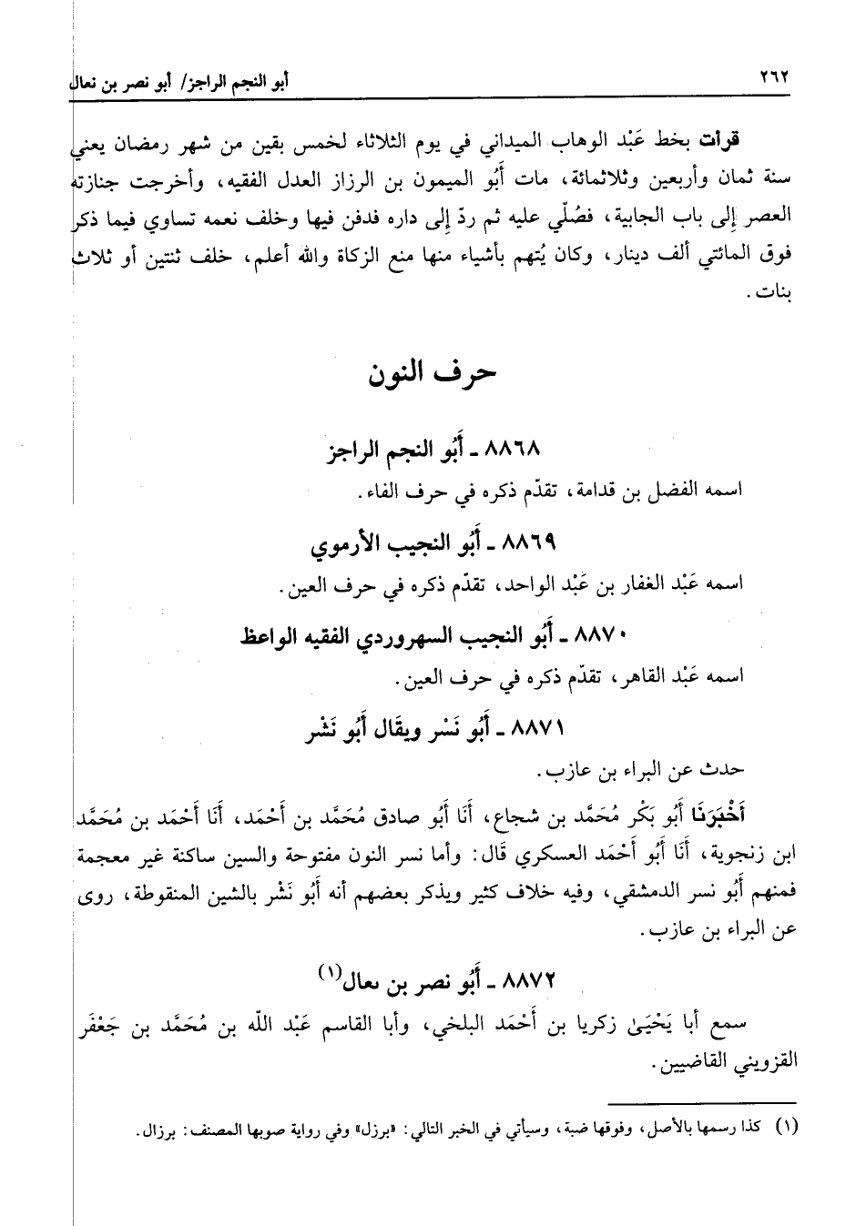 8868 - أبو النجم الراجز اسمه الفضل بن قدامة تقدم ذكره في حرف الفاء 8869 أبو نجيب الارموي اسمه عبد الغفار بن عبد الواحد تقدم ذكره في حرف العين