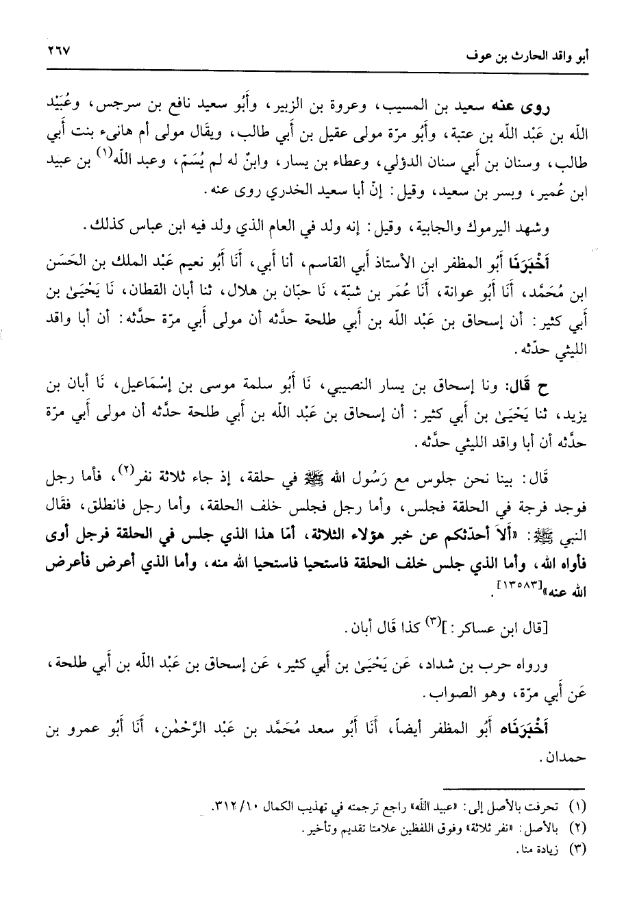 روى عنه سعيد بن المسيب وعروة بن الزبير وأبو سعيد نافع بن سرجس وعبيد الله بن عبد الله بن عتبة وأبو مرة مولى عقيل بن أبي طالب ويقال مولى أم هانئ بنت أبي طالب وسنان بن أبي سنان الدؤلى وعطاء بن يسار وابن له يسم وعبد الله (1) بن عبيد ابن عمير وبسر بن سعيد وقيل أن ابا سعيد الخدرى روى عنه وشهد اليرموك والجابية وقيل إنه ولد في العام الذي ولد فيه ابن عباس كذلك أخبرنا أبو المظفر ابن الأستاذ أبي القاسم أنا أبي أنا أبو نعيم عبد الملك بن الحسن ابن محمد أنا أبو عوانة أنا عمر بن شبة نا حبان بن هلال ثنا أبان القطان نا يحيى بن أبي كثير أن إسحاق بن عبد الله بن أبي طلحة حدثه أن مولى أبي مرة حدثه أن أبا واقد الليثي حدثه ح قال ونا إسحاق بن يسار النصيبي نا أبو سلمة موسى بن إسماعيل نا أبان بن يزيد ثنا يحيى بن أبي كثير أن إسحاق بن عبد الله بن أبي طلحة حدثه أن مولى أبي مرة حدثه أن أبا واقد الليثي حدثه قال بينا نحن جلوس مع رسول الله (صلى الله عليه وسلم) في حلقة إذا جاء ثلاثة (2) نفر فأما رجل فوجد فرجة في الحلقة فجلس وأما رجل فجلس خلف الحلقة وأما رجل فانطلق فقال النبي (صلى الله عليه وسلم) ألا أحدثكم عن خبر هؤلاء الثلاثة أما هذا الذي جلس في الحلقة فرجل أوى فأواه الله وأما الذي جلس خلف الحلقة فاستحيا الله منه وأما الذي أعرض فأعرض الله عنه قال ابن عساكر (3) كذا قال أبان ورواه حرب بن شداد عن يحيى بن أبي كثير عن إسحاق بن عبد الله بن أبي طلحة عن أبي مرة وهو الصواب أخبرناه أبو المظفر أيضا أنا أبو سعد محمد بن عبد الرحمن أنا أبو عمرو بن حمدان