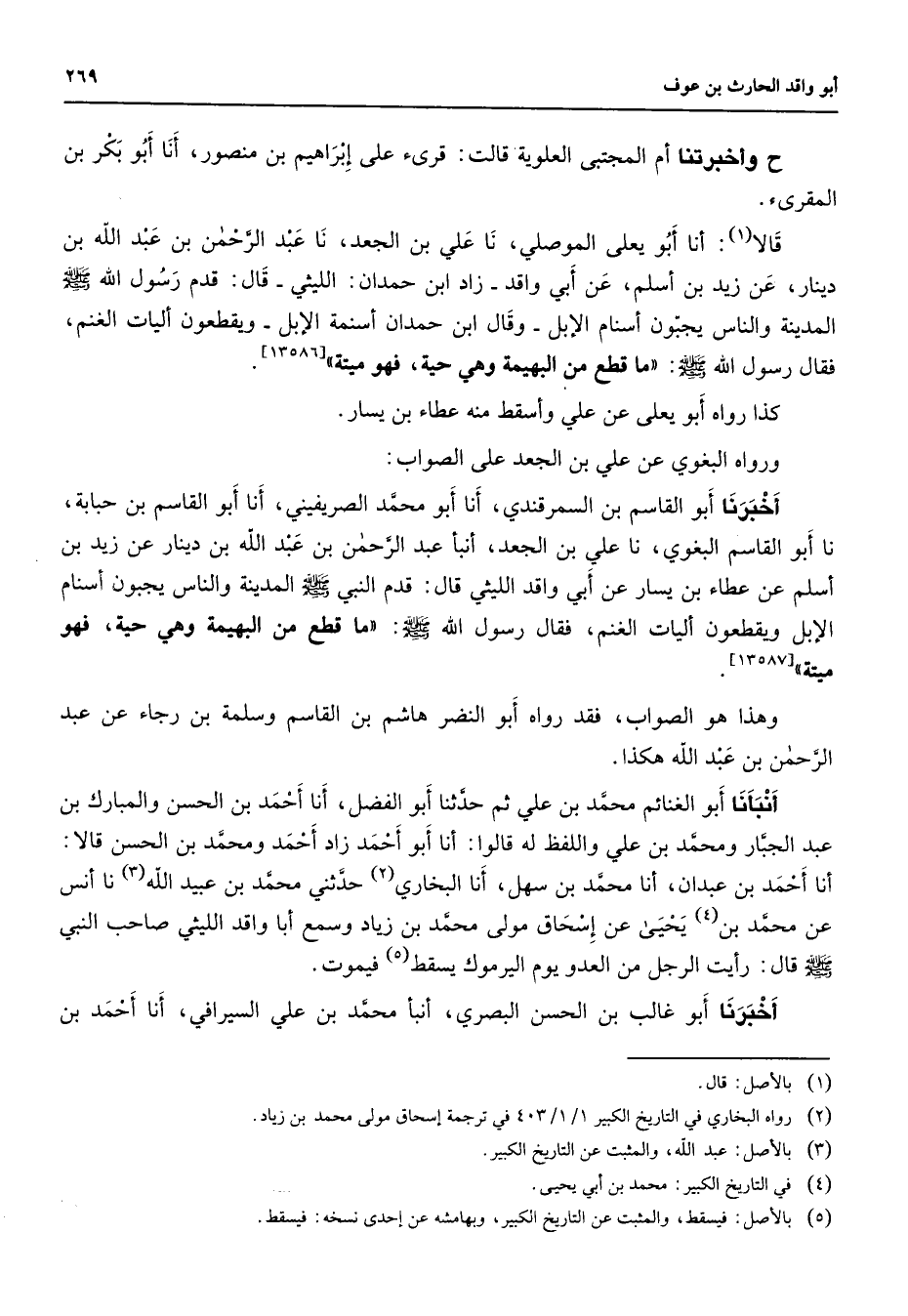 ح وأخبرتنا أم المجتبي العلوية قالت قرئ على إبراهيم بن منصور أنا أبو بكر بن المقرئ قالا (1) أنا أبو يعلي الموصلي نا علي بن الجعد نا عبد الرحمن بن عبد الله بن دينار عن زيد بن أسلم عن أبي واقد زاد ابن حمدان الليثي قال قدم رسول الله (صلى الله عليه وسلم) المدينة والناس يجبون أسنام الإبل وقال ابن حمدان أسنمة الإبل ويقطعون أليات الغنم فقال رسول الله (صلى الله عليه وسلم) ما قطع من البهيمة وهي حية فهو ميتة كذا رواه أبو يعلى عن علي وأسقط منه عطاء بن يسار ورواه البغوي عن على بن الجعد على الصواب أخبرنا أبو القاسم بن السمرقندي أنا أبو محمد الصريفيني أنا أبو القاسم بن حبابة نا أبو القاسم البغوي نا علي بن الجعد أنبأ عبد الرحمن بن عبد الله بن دينار عن زيد بن أسلم عن عطاء بن يسار عن أبي واقد الليثي قال قدم النبي (صلى الله عليه وسلم) المدينة والناس يجبون أسنام الإبل ويقطعون أليات الغنم فقال رسول الله (صلى الله عليه وسلم) ما قطع من البهيمة وهي حية فهو ميتة وهذا هو الصواب فقد رواه أبو النضر هاشم بن القاسم وسلمة بن رجاء عن عبد الرحمن بن عبد الله هكذا أنبأنا أبو الغنائم محمد بن علي ثم حدثنا أبو الفضل أنا أحمد بن الحسن والمبارك بن عبد الجبار ومحمد بن علي واللفظ له قالوا أنا أبو أحمد زاد أحمد ومحمد بن الحسن قالا أنا أحمد بن عبدان أنا محمد بن سهل أنا البخاري (2) حدثني محمد بن عبيد الله (3) نا أنس عن محمد بن (4) يحيى عن إسحاق مولى محمد بن زياد وسمع أبا واقد الليثي صاحب النبي (صلى الله عليه وسلم) قال رأيت الرجل من العدو يوم اليرموك يسقط (5) فيموت أخبرنا أبو غالب بن الحسن البصري أنبأ محمد بن علي السيرافي أنا أحمد بن