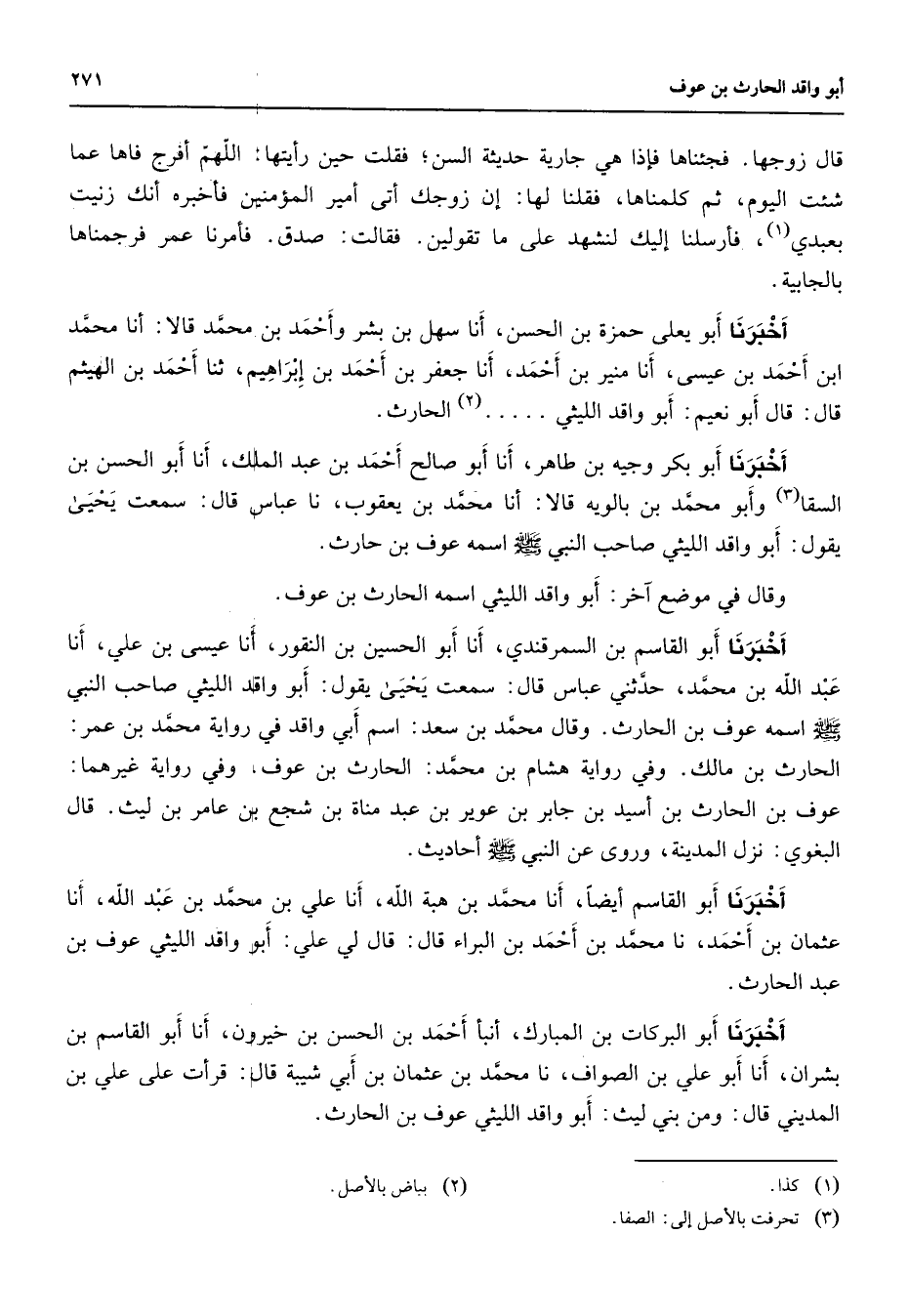 قال زوجها فجئناها فإذا هي جارية حديثه السن فقلت حين رأيتها اللهم أفرج فاها عما شئت اليوم ثم كلمناها فقلنا لها إن زوجك أتي أمير المؤمنين فأخبره أنك زنيت بعبدي (1) فأرسلنا إليك لنشهد على ما تقولين فقالت صدق فأمرنا عمر فرجمناها بالجابية أخبرنا أبو يعلى حمزة بن الحسن أنا سهل بن بشر وأحمد بن محمد قالا أنا محمد ابن أحمد بن عيسى أنا منير بن أحمد أنا جعفر بن أحمد بن إبراهيم ثنا أحمد بن الهيثم قال قال أبو نعيم أبو واقد الليثي (2) الحارث أخبرنا أبو بكر وجيه بن طاهر أنا أبو صالح أحمد بن عبد الملك أنا أبو الحسن بن السقا (3) أبو محمد بن وبالويه قالا أنا محمد بن يعقوب نا عباس قال سمعت يحيى يقول أبو واقد الليثي صاحب النبي (صلى الله عليه وسلم) اسمه عوف بن الحارث وقال في موضع آخر أبو واقد الليثي اسمه الحارث بن عوف أخبرنا أبو القاسم بن السمرقندي أنا أبو الحسن بن النقور أنا عيسى بن علي أنا عبد الله بن محمد حدثني عباس قال سمعت يحيى يقول أبو واقد الليثي صاحب النبي (صلى الله عليه وسلم) اسمه عوف بن الحارث وقال محمد بن سعد اسم أبي واقد في رواية محمد بن عمر الحارث بن مالك وفي رواية هشام بن محمد الحارث بن عوف وفي رواية غيرهما عوف بن حارث بن أسيد بن جابر بن عوير بن عبد مناة بن شجع بن عامر بن ليث قال البغوي نزل المدينة وروى عن النبي (صلى الله عليه وسلم) أحاديث أخبرنا أبو القاسم أيضا أنا محمد بن هبة الله أنا علي بن محمد بن عبد الله أنا عثمان بن أحمد نا محمد بن أحمد بن البراء قال قال لي علي أبو واقد الليثي عوف بن عبد الحارث أخبرنا أبو البركات بن المبارك أنبأ أحمد بن الحسن بن خيرون أنا أبو القاسم بن بشران أنا أبو علي بن الصواف نا محمد بن عثمان بن أبي شيبة قال قرأت على علي بن المديني قال ومن بني ليث أبو واقد الليثي عوف بن الحارث