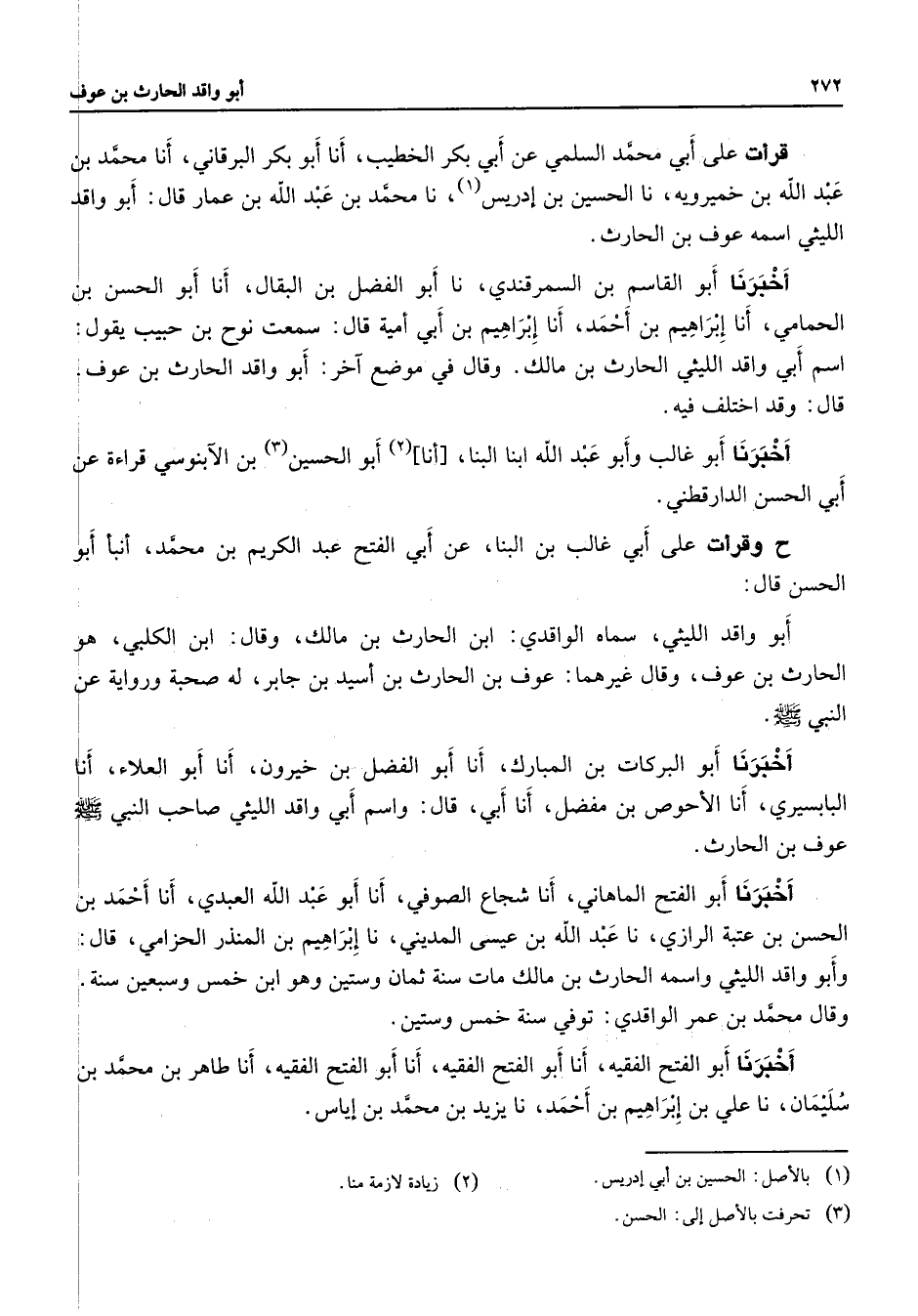 قرأت على أبي محمد السلمي عن أبي بكر الخطيب أنا أبو بكر البرقاني أنا محمد بن عبد الله بن خميرويه نا الحسين بن إدريس (1) نا محمد بن عبد الله بن عمار قال أبو واقد الليثي اسمه عوف بن الحارث أخبرنا أبو القاسم بن السمرقندي نا أبو الفضل بن البقال أنا أبو الحسن بن الحمامي أنا ابراهيم بن أحمد أنا إبراهيم بن أبي أمية قال سمعت نوح بن حبيب يقول اسم أبي واقد الليثي الحارث بن مالك وقال في موضع آخر أبو واقد الحارث بن عوف قال وقد اختلف فيه أخبرنا أبو غالب وأبو عبد الله ابنا البنا أنا (2) أبو الحسين (3) بن الآبنوسي قراءة عن أبي الحسن الدارقطني ح وقرأت على أبي غالب بن البنا عن أبي الفتح عبد الكريم بن محمد أنبأ أبو الحسن قال أبو واقد الليثي سماه الواقدي ابن الحارث بن مالك وقال ابن الكلبي هو الحارث بن عوف وقال غيرهما عوف بن الحارث بن أسيد بن جابر له صحبة ورواية عن النبي (صلى الله عليه وسلم) أخبرنا أبو البركات بن المبارك أنا أبو الفضل بن خيرون أنا أبو العلاء أنا البابسيري أنا الأحوص بن مفضل أنا أبي قال واسم أبي واقد الليثي صاحب النبي صلى الله عليه وسلم بن الحارث أخبرنا أبو الفتح الماهاني أنا شجاع الصوفي أنا أبو عبد الله العبدي أنا أحمد بن الحسن بن عتبة الرازي نا عبد الله بن عيسى المديني نا إبراهيم بن المنذر الحزامي قال وأبو واقد الليثي واسمه الحارث بن مالك مات سنة ثمان وستين وهو ابن خمس وسبعين سنة وقال محمد بن عمر الواقدي توفي سنة خمس وستين أخبرنا أبو الفتح الفقيه أنا أبو الفتح الفقيه أنا أبو الفتح الفقيه أنا طاهر بن محمد بن سليمان نا على بن إبراهيم بن أحمد نا يزيد بن محمد بن إياس