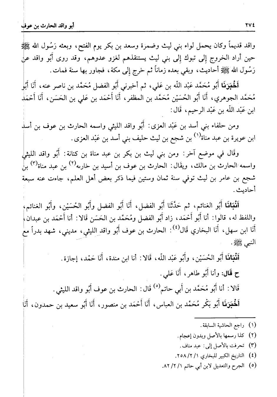 واقد قديما وكان يحمل لواء بني ليث وضمرة وسعد بن بكر يوم الفتح وبعثه رسول الله (صلى الله عليه وسلم) حين أراد الخروج إلى تبوك إلى بني ليث يستنقذهم لغزو عدوهم وقد روى أبو واقد عن رسول الله (صلى الله عليه وسلم) أحاديث وبقي بعده زمانا ثم خرج إلى مكة فجاور بها سنة فمات أخبرنا أبو محمد عبد الله بن علي ثم أخبرني أبو الفضل محمد بن ناصر عنه أنا أبو محمد الجوهرى أنا أبو الحسين محمد بن المظفر أنا أحمد بن علي بن الحسن أنا أحمد ابن عبد الله بن عبد الرحيم قال ومن حلفاء بني أسد بن عبد العزى أبو واقد الليثي واسمه الحارث بن عوف بن أسد ابن عويرة بن عبد مناة (1) بن شجع بن ليث حليف بني أسد بن عبد العزى وقال في موضع آخر ومن بني ليث بن بكر بن عبد مناة بن كنانة أبو واقد الليثي واسمه الحارث بن مالك ويقال الحارث بن عوف بن أسيد بن خارنة (2) بن عبد مناة (3) بن شجع بن عامر بن ليث توفي سنة ثمان وستين فيما ذكر بعض أهل العلم جاءت عنه سبعة أحاديث أنبأنا أبو الغنائم ثم حدثنا أبو الفضل أنا أبو الفضل وأبو الحسين وأبو الغنائم واللفظ له قالوا أنا أبو أحمد زاد أبو الفضل ومحمد بن الحسن قالا أنا أحمد بن عبدان أنا ابن سهل أنا البخاري قال (4) الحارث بن عوف أبو واقد الليثي مديني شهد بدرا مع النبي (صلى الله عليه وسلم) أنبأنا أبو الحسين وأبو عبد الله قالا أنا ابن مندة أنا حمد إجازة ح قال وأنا أبو طاهر أنا علي قالا أنا أبو محمد بن أبي حاتم (5) قال الحارث بن عوف أبو واقد الليثي أخبرنا أبو بكر محمد بن العباس أنا أحمد بن منصور أنا أبو سعيد بن حمدون أنا