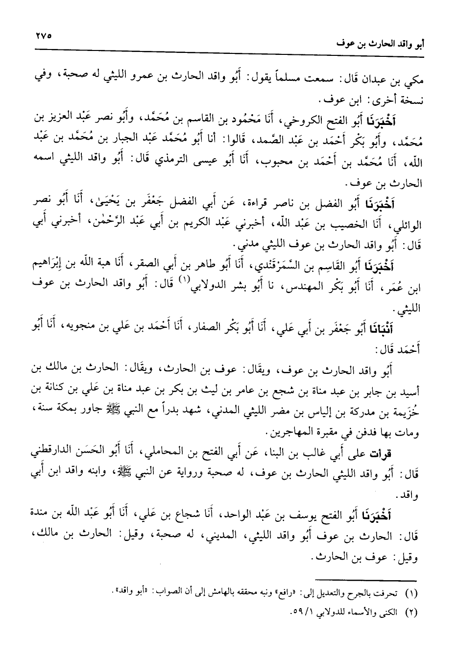 مكي بن عبدان قال سمعت مسلما يقول أبو واقد الحارث بن عمرو الليثي له صحبة وفي نسخة أخرى ابن عوف أخبرنا أبو الفتح الكروخي أنا محمود بن القاسم بن محمد وأبو نصر عبد العزيز بن محمد وأبو بكر أحمد بن عبد الصمد قالوا أنا أبو محمد عبد الجبار بن محمد بن عبد الله أنا محمد بن أحمد بن محبوب أنا أبو عيسى الترمذي قال أبو واقد الليثي اسمه الحارث بن عوف أخبرنا أبو الفضل بن ناصر قراءة عن أبي الفضل جعفر بن يحيى أنا أبو نصر الوائلي أنا الخصيب بن عبد الله أخبرني عبد الكريم بن أبي عبد الرحمن أخبرني أبي قال أبو واقد الحارث بن عوف الليثي مدني أخبرنا أبو القاسم بن السمرقندي أنا أبو طاهر بن أبي الصقر أنا هبة الله بن إبراهيم ابن عمر أنا أبو بكر المهندس نا أبو بشر الدولابي (1) قال أبو واقد الحارث بن عوف الليثي أنبأنا أبو جعفر بن أبي علي أنا أبو بكر الصفار أنا أحمد بن علي بن منجويه أنا أبو أحمد قال أبو واقد الحارث بن عوف ويقال عوف بن الحارث ويقال الحارث بن مالك بن أسيد بن جابر بن عبد مناة بن شجع بن عامر بن ليث بن بكر بن عبد مناة بن علي بن كنانة بن خزيمة بن مدركة بن إلياس بن مضر الليثي المدني شهد بدرا مع النبي (صلى الله عليه وسلم) جاور بمكة سنة ومات بها فدفن في مقبرة المهاجرين قرأت على أبي غالب بن البنا عن أبي الفتح المحاملي أنا أبو الحسن الدارقطني قال أبو واقد الليثي الحارث بن عوف له صحبة ورواية عن النبي (صلى الله عليه وسلم) وابنه واقد ابن أبي واقد أخبرنا أبو الفتح يوسف بن عبد الواحد أنا شجاع بن علي أنا أبو عبد الله بن مندة قال الحارث بن عوف أبو واقد الليثي المديني له صحبة وقيل الحارث بن مالك وقيل عوف بن الحارث