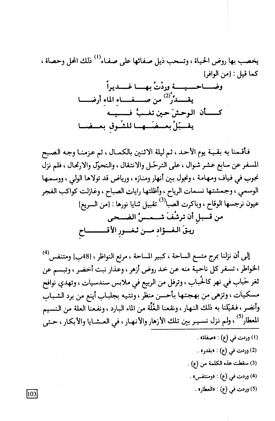 فأقمنا به بقية يوم الأحد، ثم ليلة الاثنين بالكمال، ثم عزمنا وجه الصبح المسفر عن سابع عشر شوال، على الترحل والانتقال، والتحول والارتحال، فلم نزل نجوب في فياف ومهامة، ونجول بين أنهار ومنازه، ورياض قد تولاها الولي، ووسمها الوسمي، وجمشتها نسمات الرياح، وأظلتها رايات الصباح، وغازلت كواكب الفجر عيون نرجسها الوقاح، وباكرت الصبا تقبيل ثنايا نورها: