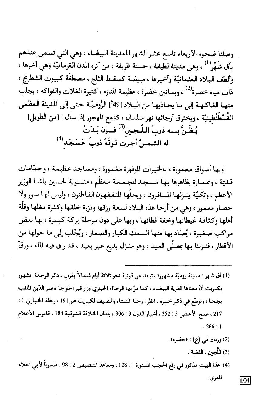 وصلنا ضحوة الأربعاء تاسع عشر الشهر للمدينة البيضاء، وهي التي تسمى عندهم بآق شَهْر، وهي مدينة لطيفة، حسنة ظريفة، من أنزه المدن القرمانيّة وهي آخرها، وألطف البلاد العثمانيّة وأخيرها، مبيضة كسقيط الثلج، مصطفة كبيوت الشطرنج، ذات مياه خصرة، وبساتين خضرة عظيمة المنازه، كثيرة الغلات والفواكه، يجلب منها الفاكهة إلى ما يحاذيها من البلاد الرُّوميّة حتى إلى المدينة العظمى القُسْطَنْطِينيّة، ويخترق أرجائها نهر سلسال، كدمع المهجور إذا سال: