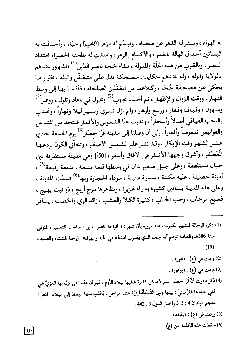 به الهواء، وسفر له الدهر عن محياه، وتبسّم له الزهر وحيّاه، وأحدقت به البساتين أحداق الهالة بالقمر، والأكمام بالزهر، وامتدت له بطحته الخضراء امتداد البصر، وبالقرب من هذه المحلة والمنزلة، مقام خجا ناصر الدِّين المشهور عندهم بالولاية والوله، وله عندهم حكايات مضحكة تدل على التغفل والبله، نظير ما يحكى عن مصحفة جُحَا، وكلاهما من المغفلين الصلحاء، فأقمنا بها إلى وسط النهار، ووقت الزوال والإظهار، ثم أخذنا نجوب ونجول في وهاد وتلول، ووعر وسهول، وفياف وقفار، وربيع وأزهار، ولم نزل نسري ونسير ليلاً ونهاراً، ونجدب بالنجب الفيافي أصالاً وأسحاراً، وتغيب عنّا الشموس والأقمار فنتخذ من المشاعل والفوانيس شموساً وأقماراً، إلى أن وصلنا إلى مدينة قَرَا حِصَار يوم الجمعة حادي عشر الشهر وقت الإبكار، وقد نشر علم الشمس الأصفر، وتخلق الكون بردعها المُعَصْفَر، وأشرق وجهها الأشقر في الآفاق وأسفر، وهي مدينة مستظرفة بين جبال مستلطفة، وعلى جبل صغير عال في وسطها قلعة منيعة، بديعة رفيعة، أمينة حصينة، علية مكينة، سمية متينة، سوداء الحجارة وبها تسمّت