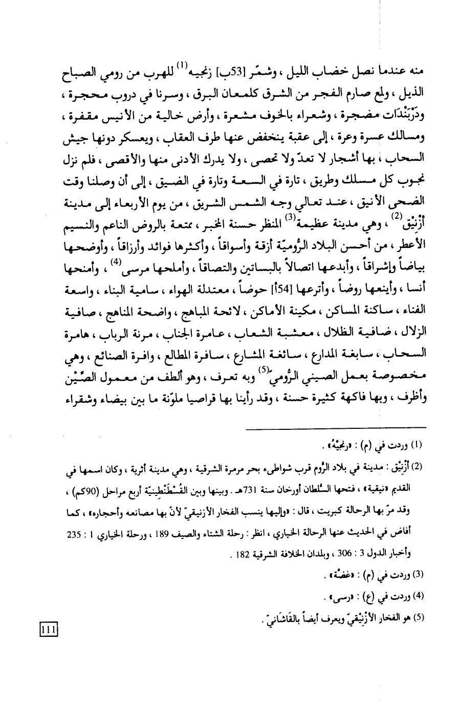 منه عندما نصل خضاب الليل، وشمّر زنجيه للهرب من رومي الصباح الذيل، ولمع صارم الفجر من الشرق كلمعان البرق، وسرنا في دروب محجرة، ودَرْبَنْدَات مضجرة، وشعراء بالخوف مشعرة، وأرض خالية من الأنيس مقفرة، ومسالك عسرة وعرة، إلى عقبة ينخفض عنها طرف العقاب، ويعسكر دونها جيش السحاب، بها أشجار لا تعد ولا تحصى، ولا يدرك الأدنى منها والأقصى، فلم نزل نجوب كل مسلك وطريق، تارة في السعة وتارة في الضيق، إلى أن وصلنا وقت الضحى الأنيق، عند تعالي وجه الشمس الشريق، من يوم الأربعاء إلى مدينة أزْنِيْق، وهي مدينة عظيمة المنظر حسنة المخبر، ممتعة بالروض الناعم والنسيم الأعطر، من أحسن البلاد الرُّوميّة أزقة وأسواقاً، وأكثرها فوائد وأرزاقاً، وأوضحها بياضاً وإشراقاً، وأبدعها اتصالاً بالبساتين والتصاقاً، وأملحها مرسى، وأمنحها أنسا، وأينعها روضاً، وأترعها حوضاً، معتدلة الهواء، سامية البناء، واسعة الفناء، ساكنة المساكن، مكينة الأماكن، لائحة المباهج، واضحة المناهج، صافية الزلال، ضافية الظلال، معشبة الشعاب، عامرة الجناب، مرنة الرباب، هامرة السحاب، سابغة المدارع، سائغة المشارع، سافرة المطالع، وافرة الصنائع،