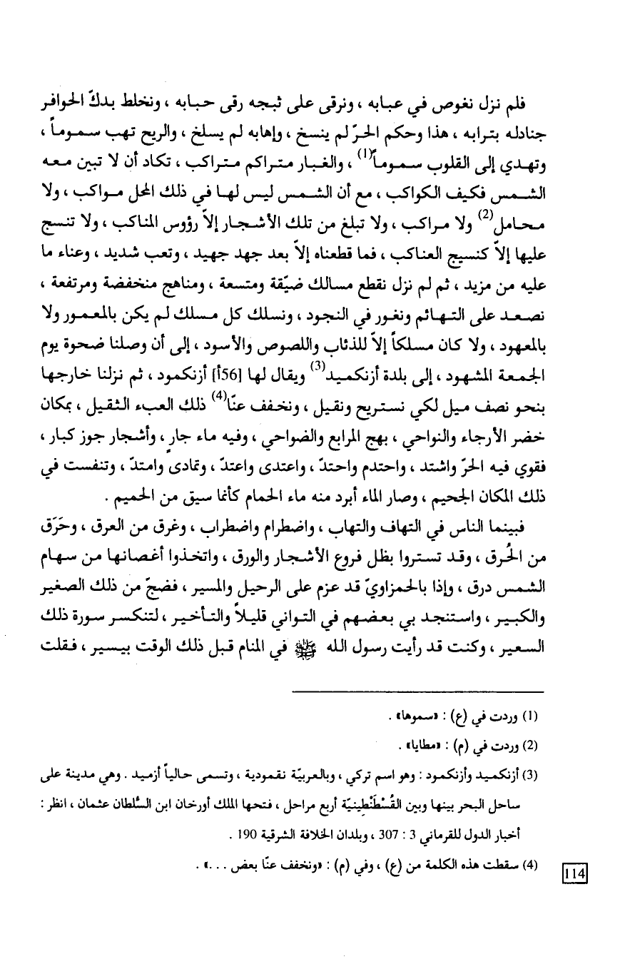 فلم نزل نغوص في عبابه، ونرقى على ثبجه رقى حبابه، ونخلط بدك الحوافر جنادله بترابه، هذا وحكم الحرّ لم ينسخ، وإهابه لم يسلخ، والريح تهب سموماً، وتهدي إلى القلوب سموماً، والغبار متراكم متراكب، تكاد أن لا تبين معه الشمس فكيف الكواكب، مع أن الشمس ليس لها في ذلك المحل مواكب، ولا محامل ولا مراكب، ولا تبلغ من تلك الأشجار إلاّ رؤوس المناكب، ولا تنسج عليها إلاّ كنسيج العناكب، فما قطعناه إلاّ بعد جهد جهيد، وتعب شديد، وعناء ما عليه من مزيد، ثم لم نزل نقطع مسالك ضيّقة ومتسعة، ومناهج منخفضة ومرتفعة، نصعد على التهائم ونغور في النجود، ونسلك كل مسلك لم يكن بالمعمور ولا بالمعهود، ولا كان مسلكاً إلاّ للذئاب واللصوص والأسود، إلى أن وصلنا ضحوة يوم الجمعة المشهود، إلى بلدة أزنكميد ويقال لها أزنكمود، ثم نزلنا خارجها بنحو نصف ميل لكي نستريح ونقيل، ونخفف عنّا ذلك العبء الثقيل، بمكان خضر الأرجاء والنواحي، بهج المرابع والضواحي، وفيه ماء جارٍ، وأشجار جوز كبار، فقوي فيه الحرّ واشتد، واحتدم واحتدّ، واعتدى واعتدّ، وتمادى وامتدّ، وتنفست في ذلك