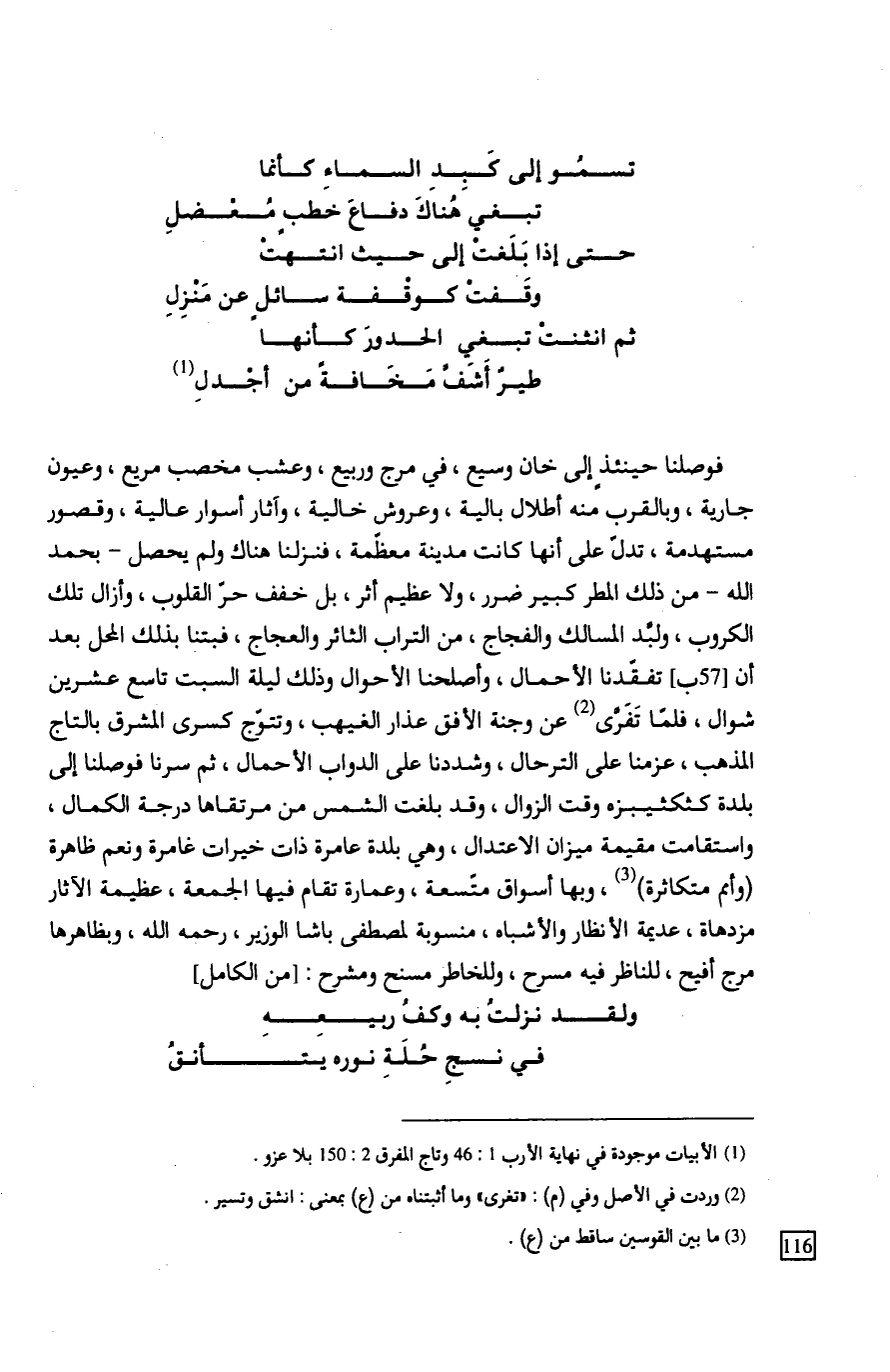 فوصلنا حينئذٍ إلى خان وسيع، في مرج وربيع، وعشب مخصب مريع، وعيون جارية، وبالقرب منه أطلال بالية، وعروش خالية، وآثار أسوار عالية، وقصور مستهدمة، تدلّ على أنها كانت مدينة معظمة، فنزلنا هناك ولم يحصل بحمد الله من ذلك المطر كبير ضرر، ولا عظيم أثر، بل خفف حر القلوب، وأزال تلك الكروب، ولبَّد المسالك والفجاج، من التراب الثائر والعجاج، فبتنا بذلك المحل بعد أن تفقدنا الأحمال، وأصلحنا الأحوال وذلك ليلة السبت تاسع عشرين شوال، فلمّا تَفَرَّى عن وجنة الأفق عذار الغيهب، وتتوج كسرى المشرق بالتاج المذهب، عزمنا على الترحال وشددنا على الدواب الأحمال، ثم سرنا فوصلنا إلى بلدة كثكثيبزه وقت الزوال، وقد بلغت الشمس من مرتقاها درجة الكمال، واستقامت مقيمة ميزان الاعتدال، وهي بلدة عامرة ذات خيرات غامرة ونعم ظاهرة (وأمم متكاثرة)، وبها أسواق متّسعة، وعمارة تقام فيها الجمعة، عظيمة الآثار مزدهاة، عديمة الأنظار والأشباه، منسوبة لمصطفى باشا الوزير رحمه الله، وبظاهرها مرج أفيح، للناظر فيه مسرح، وللخاطر مسنح ومشرح: