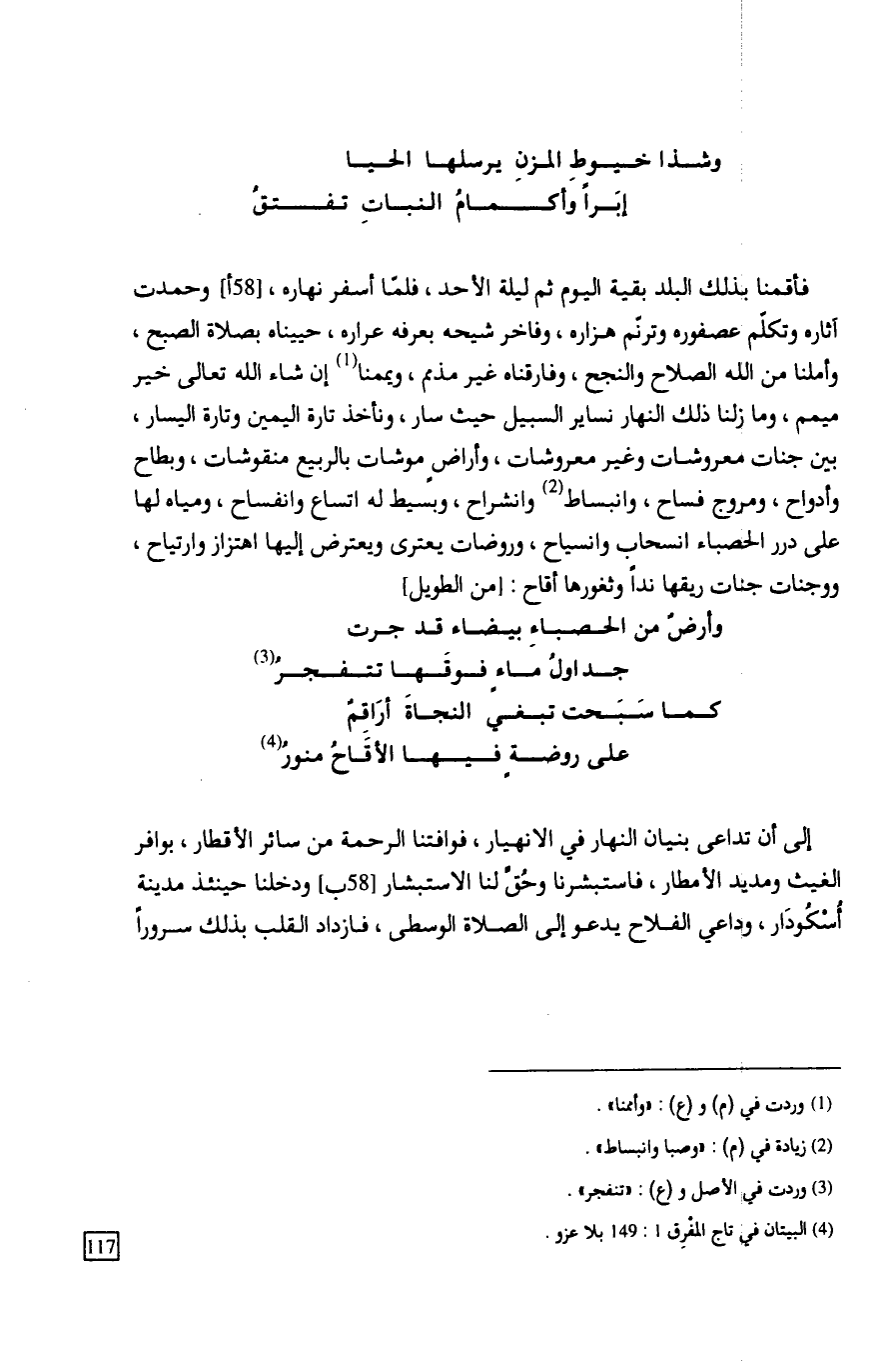 فأقمنا بذلك البلد بقية اليوم ثم ليلة الأحد، فلمّا أسفر نهاره، وحمدت آثاره وتكلم عصفوره وترنّم هزاره، وفاخر شيحه بعرفه عراره، حييناه بصلاة الصبح، وأملنا من الله الصلاح والنجح، وفارقناه غير مذمم، ويممنا إن شاء الله تعالى خير ميمم، وما زلنا ذلك النهار نساير السبيل حيث سار، ونأخذ تارة اليمين وتارة اليسار، بين