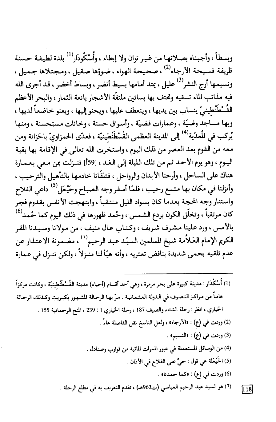 وبسطاً، وأجبناه بصلاتها من غير توان ولا إبطاء، وأُسْكُودَار بلدة لطيفة حسنة ظريفة فسيحة الأرجاء، صحيحة الهواء، ضوؤها صقيل، ومجتلاها جميل، ونسيمها أرج النشر عليل، يمتد أمامها بسيط أنضر، وبساط أخضر، قد أجرى الله فيه مذانب الماء تسقيه وتحتف بها بساتين ملتفّة الأشجار يانعة الثمار، والبحر الأعظم القُسْطَنْطِينيّ ينساب بين يديها، وينعطف عليها، ويحنو إليها، ويعنو خاضعاً لديها، وبها مساجد وضيّة وعمارات فضيّة وأسواق حسنة وخانات مستحسنة، ومنها يُركب في المُعدّية إلى المدينة العظمى القُسْطَنْطِينيّة، فعدى الحمزاويّ بالخزانة ومن معه من القوم بعد العصر من ذلك اليوم، واستخرت الله تعالى في الإقامة بها بقية اليوم، وهو يوم الأحد ثم من تلك الليلة إلى الغد، فنزلت بمن معي بعمارة هناك على الساحل، وأرحنا الأبدان والرواحل، فتلقّانا خادمها بالتأهيل والترحيب، وأنزلنا في مكان بها متسع رحيب، فلمّا أسفر وجه الصباح وحَيْعَل داعي الفلاح واستنار وجه المحجة بعدما كان بسواد الليل منتقباً، وابتهجت الأنفس بقدوم فجر كان مرتقباً، وتخلق الكون بردع الشمس، وحُمد ظهورها في ذلك اليوم كما حُمد