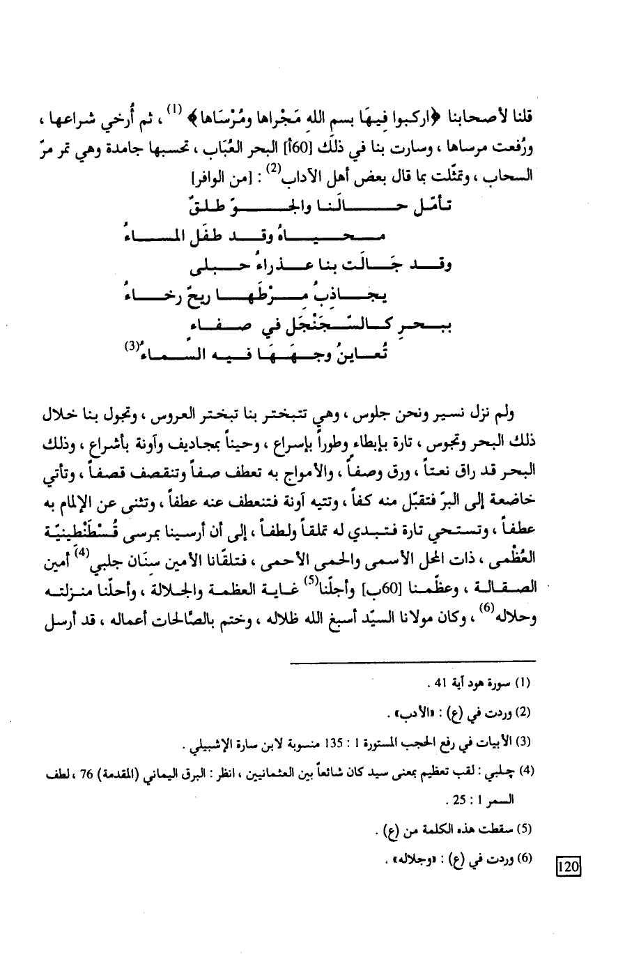 قلنا لأصحابنا (اركبوا فِيهَا بسمِ اللهِ مَجْراها ومُرْسَاها)، ثم أُرخي شراعها، ورُفعت مرساها، وسارت بنا في ذلك البحر العُبَاب، تحسبها جامدة وهي تمر مرّ السحاب، وتمثلت بما قال بعض أهل الآداب: