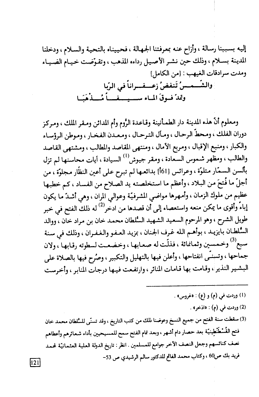 ومعلوم أنّ هذه المدينة دار الطمأنينة وقاعدة الرُّوم وأم المدائن ومقر الملك، ومركز دوران الفلك، ومحطّ الرحال، ومآل الترحال، ومعدن الفخار، وموطن الرؤساء والكبار، ومنبع الإقبال، ومربع الآمال، ومنتهى المقاصد والمطالب، ومشتهى القاصد والطالب، ومظهر شموس السعادة، ومقر جيوش السيادة، آيات محاسنها لم تزل بألسن السمّار متلوة، وعرائس بدائعها لم تبرح على أعين النظّار مجلوّة، من أجلّ ما فُتٍحَ من البلاد، وأعظم ما استخلصته يد الصلاح من الفساد، كم خطبها عظيم من ملوك الزمان، وأمهرها مواضي المشرفيّة وعوالي المران، وهي أشدّ ما يكون إباءً وأقوى ما يمكن منعه واستعصاء إلى أن قصدها من ادخر