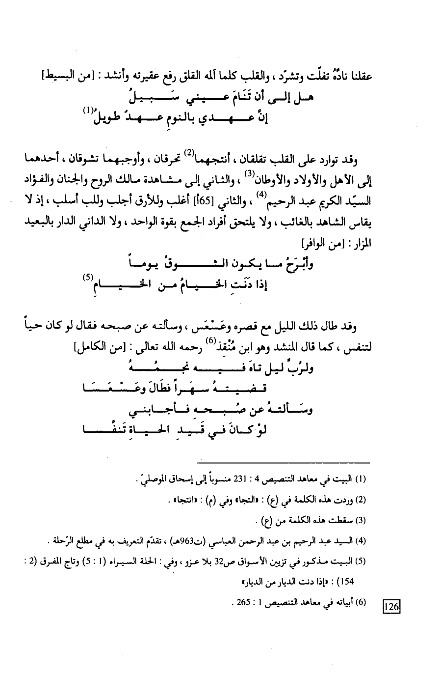 وقد توارد على القلب تقلقان، أنتجهما تحرقان، وأوجبهما تشوقان، أحدهما إلى الأهل والأولاد والأوطان، والثاني إلى مشاهدة مالك الروح والجنان والفؤاد السيد الكريم عبد الرحيم، والثاني أغلب وللأرق أجلب وللب أسلب، إذ لا يقاس الشاهد بالغائب، ولا يلتحق أفراد الجمع بقوة الواحد، ولا الداني الدار بالبعيد المزار: