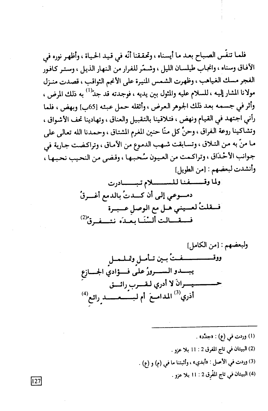 مولانا المشار إليه، للسلام عليه والمثول بين يديه، فوجدته قد جدّ به ذلك المرض، وأثر في جسمه بعد ذلك الجوهر العرض، وأثقله حمل عبئه وبهض، فلما رآني اجتهد في القيام ونهض، فتلاقينا بالتقبيل والعناق، وتهادينا تحف الأشواق، وتشاكينا روعة الفراق، وحنَّ كل منّا حنين المغرم المشتاق، وحمدنا الله تعالى على ما منّ به من التلاق، وتسابقت شهب الدموع من الآماق، وتراكضت جارية في جوانب الأحْدَاق، وتراكمت من العيون سُحبها، وقضى من النحيب نحبها، وأنشدت لبعضهم: