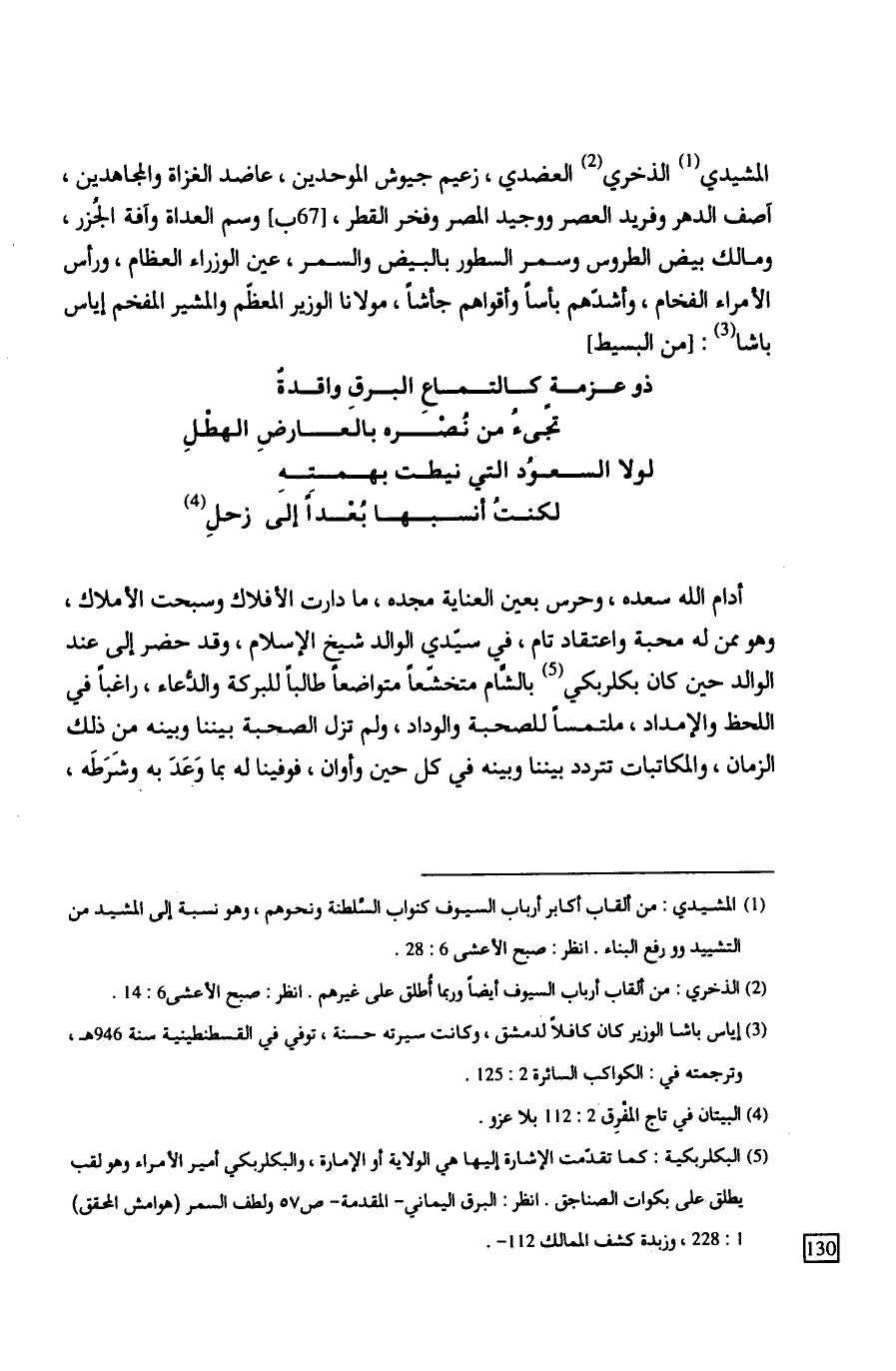 أدام الله سعده، وحرس بعين العناية مجده، ما دارت الأفلاك وسبحت الأملاك، وهو ممن له محبة واعتقاد تام، في سيدي الوالد شيخ الإسلام، وقد حضر إلى عند الوالد حين كان بكلربكي بالشَّام متخشعاً متواضعاً طالباً للبركة والدُّعاء، راغباً في اللحظ والإمداد، ملتمساً للصحبة والوداد، ولم تزل الصحبة بيننا وبينه من ذلك الزمان، والمكاتبات تتردد بيننا وبينه في كل حين وأوان، فوفينا له بما وَعَدَ به وشَرَطَه،