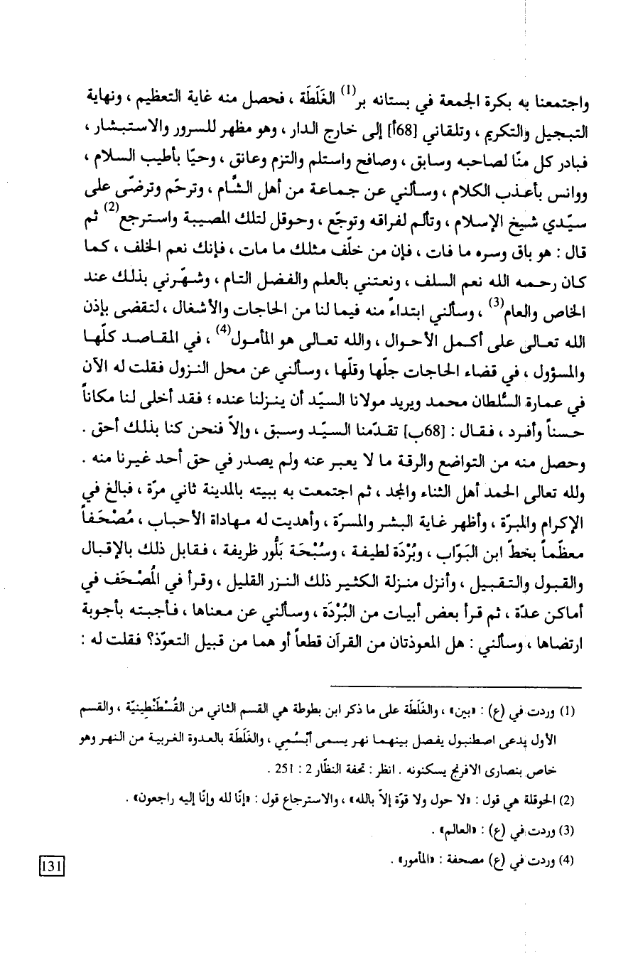 كلها والمسؤول، في قضاء الحاجات جلّها وقلّها، وسألني عن محل النزول فقلت له الآن في عمارة السُّلطان محمد ويريد مولانا السيد أن ينزلنا عنده؛ فقد أخلى لنا مكاناً حسناً وأفرد، فقال: تقدمنا السيد وسبق، وإلاّ فنحن كنا بذلك أحق. وحصل منه من التواضع والرقة ما لا يعبر عنه ولم يصدر في حق أحد غيرنا منه ولله تعالى الحمد أهل الثناء والمجد، ثم اجتمعت به ببيته بالمدينة ثاني مرّة، فبالغ في الإكرام والمبرّة، وأظهر غاية البشر والمسرّة، وأهديت له مهاداة الأحباب، مُصْحَفاً معظماً بخط ابن البَوّاب، وبُرْدَة لطيفة، وسُبْحَة بَلُّور ظريفة، فقابل ذلك بالإقبال والقبول والتقبيل، وأنزل منزلة الكثير ذلك النزر القليل، وقرأ في المُصْحَف في أماكن عدّة، ثم قرأ بعض أبيات من البُرْدَة، وسألني عن معناها، فأجبته بأجوبة ارتضاها، وسألني: هل المعوذتان من القرآن قطعاً أو هما من قبيل التعوذ؟ فقلت له: