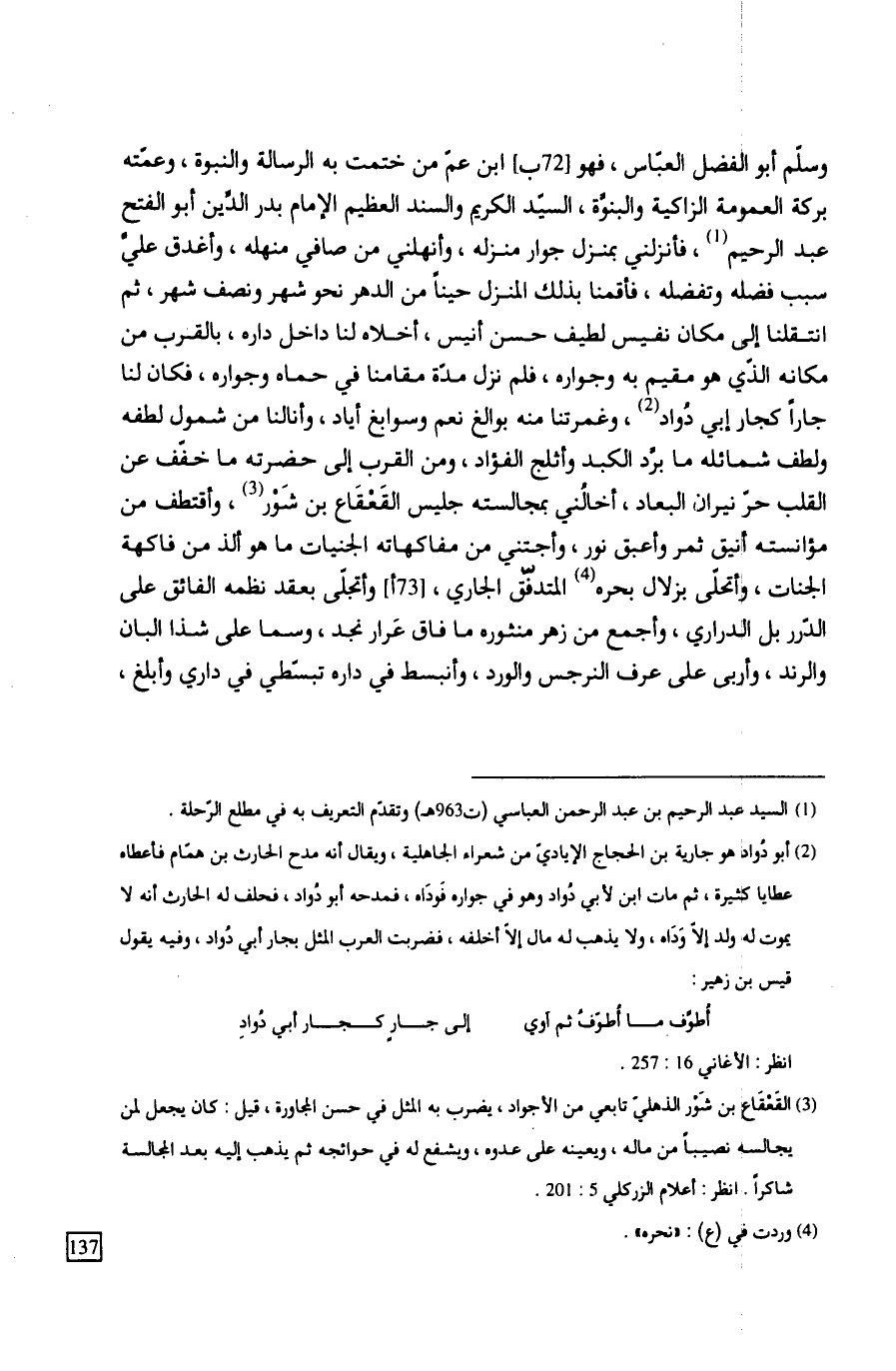 وسلم أبو الفضل العباس، فهو ابن عمّ من ختمت به الرسالة والنبوة، وعمته بركة العمومة الزاكية والبنوَّة، السيد الكريم والسند العظيم الإمام بدر الدِّين أبو الفتح عبد الرحيم، فأنزلني بمنزل جوار منزله، وأنهلني من صافي منهله، وأغدق عليَّ سبب فضله وتفضله، فأقمنا بذلك المنزل حيناً من الدهر نحو شهر ونصف شهر، ثم انتقلنا إلى مكان نفيس لطيف حسن أنيس، أخلاه لنا داخل داره، بالقرب من مكانه الذّي هو مقيم به وجواره، فلم نزل مدة مقامنا في حماه وجواره، فكان لنا جاراً كجار إبي دُواد، وغمرتنا منه بوالغ نعم وسوابغ أياد، وأنالنا من شمول لطفه ولطف شمائله ما برَّد الكبد وأثلج الفؤاد، ومن القرب إلى حضرته ما خفف عن القلب حرّ نيران البعاد، أخالُني بمجالسته جليس القَعْقَاع بن شَوْر، وأقتطف من مؤانسته أنيق ثمر وأعبق نور، وأجتني من مفاكهاته الجنيات ما هو ألذ من فاكهة الجنات، وأتحلى بزلال بحره المتدفق الجاري، وأتجلّى بعقد نظمه الفائق على الدّرر بل الدراري، وأجمع من زهر منثوره ما فاق عَرار نجد، وسما على شذا البان والرند، وأربى على عرف النرجس والورد، وأنبسط في داره تبسطي في داري وأبلغ،