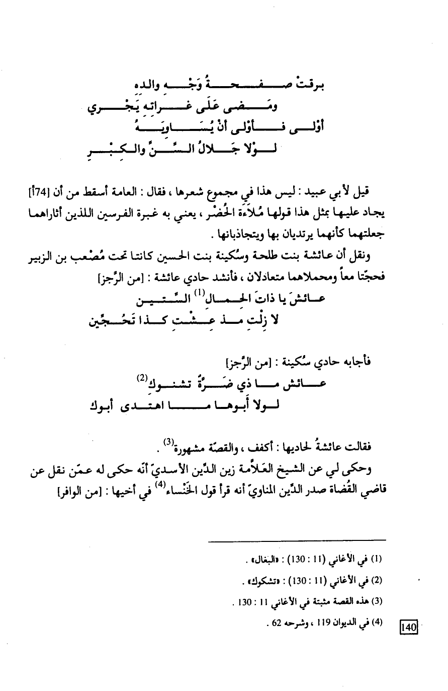 ونقل أن عائشة بنت طلحة وسُكينة بنت الحسين كانتا تحت مُصْعب بن الزبير فحجتا معاً ومحملاهما متعادلان، فأنشد حادي عائشة: