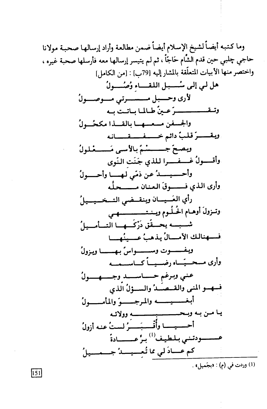 وما كتبه أيضاً لشيخ الإسلام أيضاً ضمن مطالعة وأراد إرسالها صحبة مولانا حاجي جلبي حين قدم الشَّام حَاجّاً، ثم لم يتيسر إرسالها معه فأرسلها صحبة غيره، واختصر منها الأبيات المتعلقة بالمشار إليه: