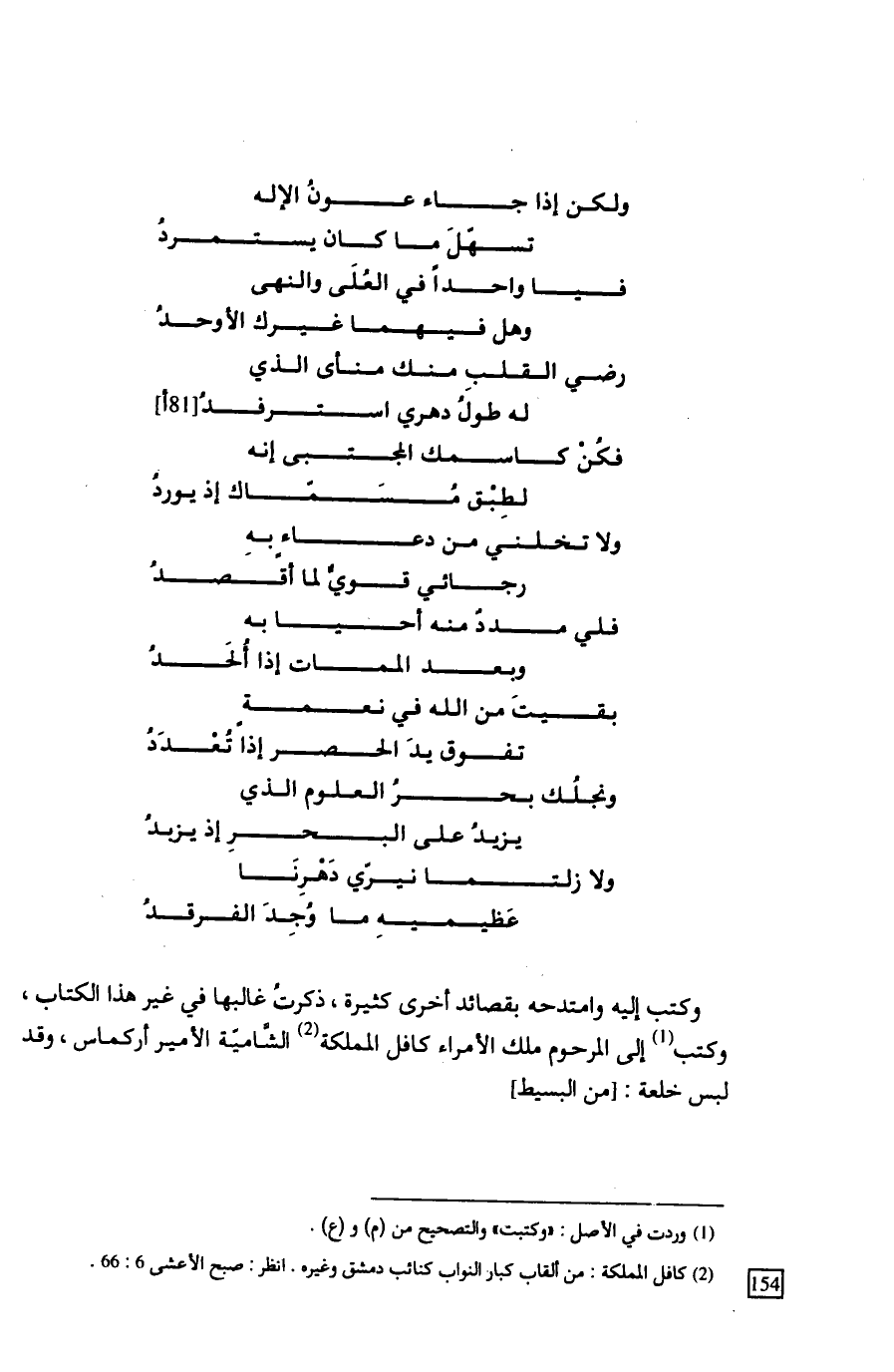 وكتب إليه وامتدحه بقصائد أخرى كثيرة، ذكرتُ غالبها في غير هذا الكتاب، وكتب إلى المرحوم ملك الأمراء كافل المملكة الشَّاميّة الأمير أركماس، وقد لبس