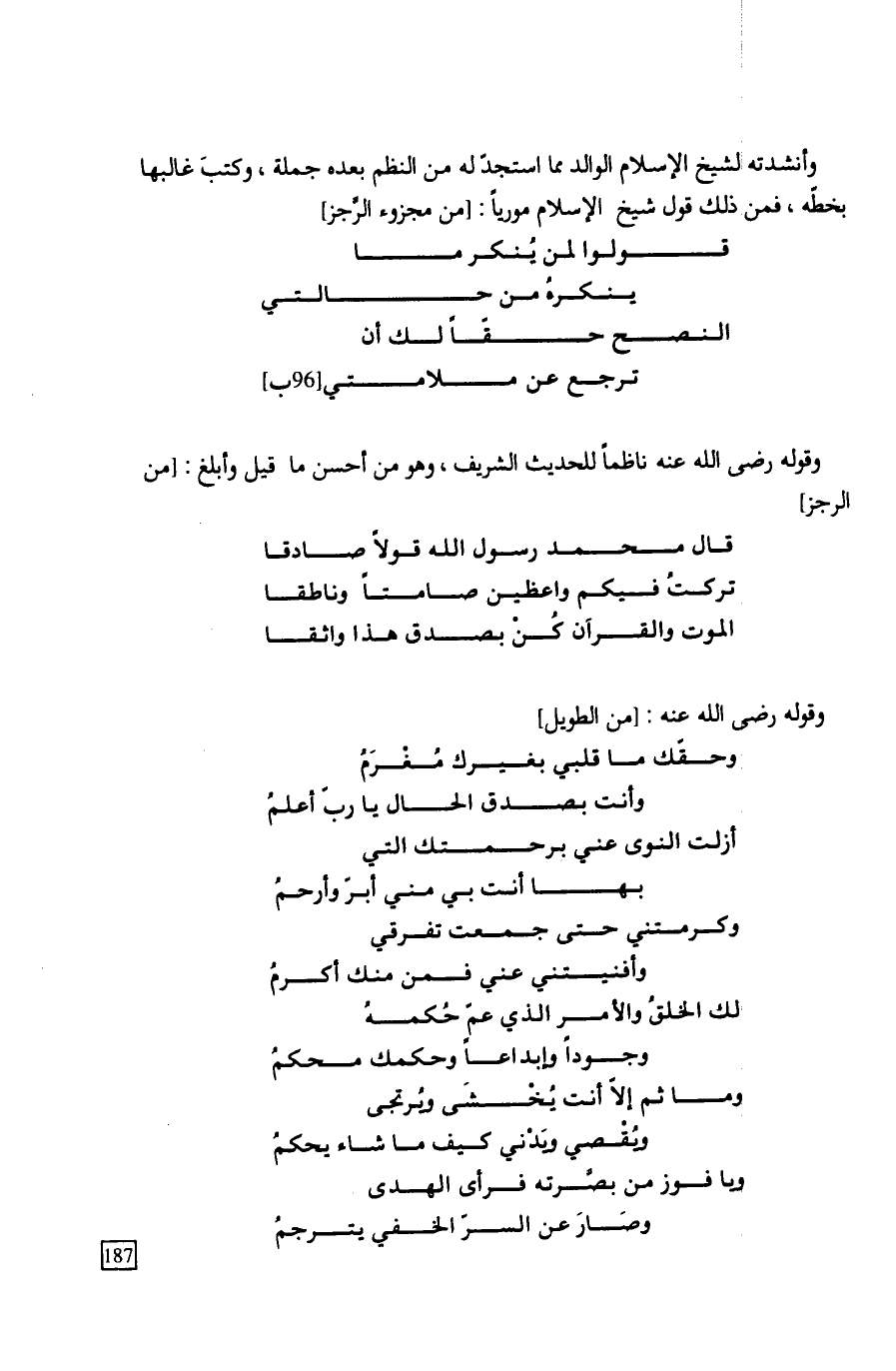 وأنشدته لشيخ الإسلام الوالد مما استجد له من النظم بعده جملة، وكتبَ غالبها بخطه، فمن ذلك قول شيخ الإسلام مورياً: