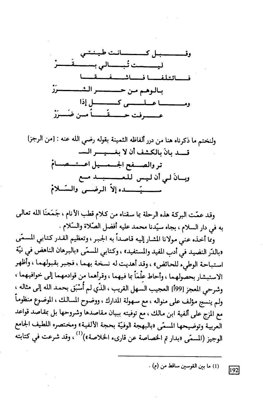 ومما أخذه عني مولانا المشار إليه قاصداً به الجبر، وتعظيم القدر كتابي المسمى بالدّر النضيد في أدب المفيد والمستفيد، وكتابي المسمى بالبرهان الناهض في نيّة استباحة الوطيء للحائض، وقد أهديت له نسخة بهما، فجبر بقبولهما، وأظهر الاستبشار بحصولهما، وأحاط عِلْمَاً بما فيهما، وقرأهما من قوادمهما إلى خوافيهما، وشرحي المعجز العجيب السهل القريب، الذّي لم أُسْبَق بحمد الله إلى مثاله، ولم ينسج مؤلف على منواله، مع سهولة المدارك، ووضوح المسالك، الموضوع منظوماً مع المزج على ألفية ابن مالك، مع توفيته ببيان مقاصدها وشروحها بل بمقاصد قواعد العربية وتوضيحها المسمّى بالبهجة الوفيّة بحجة الألفية ومختصره اللطيف الجامع الوجيز (المسمّى بدار تم الخصاصة عن قارىء الخلاصة)، وقد شرعت في كتابته