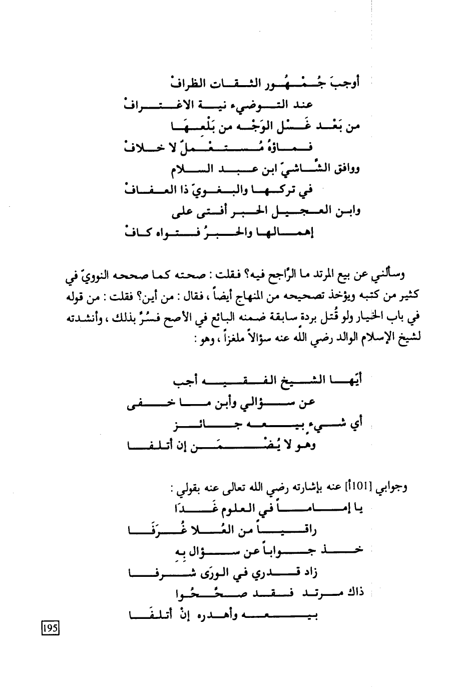 وسألني عن بيع المرتد ما الرَّاجح فيه؟ فقلت: صحته كما صححه النوويّ في كثير من كتبه ويؤخذ تصحيحه من المنهاج أيضاً، فقال: من أين؟ فقلت: من قوله في باب الخيار ولو قُتل بردةٍ سابقة ضمنه البائع في الأصح فسُرَّ بذلك، وأنشدته لشيخ الإسلام الوالد رضي الله عنه سؤالاً ملغزاً، وهو: