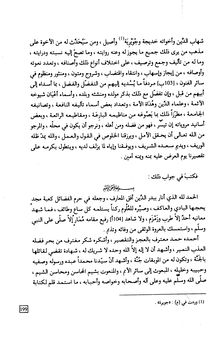 الحمد لله الذي أنار ببدر الدِّين أفق المعارف، وجعله في حرم الفضائل كعبة مجدٍ يحجها البادي والعاكف، وصيَّره للعُلُوم ركناً يستلمه كل ساعٍ وطائف، فما شهد معانيه أحدٌ إلاّ طرب وزَمْزَم، ولا شاهد رفيع مقامه مُمَارٍ إلاّ صلّى على النبي وسلّم، واستمسك بالعروة الوثقى من وفائه وتذمم.