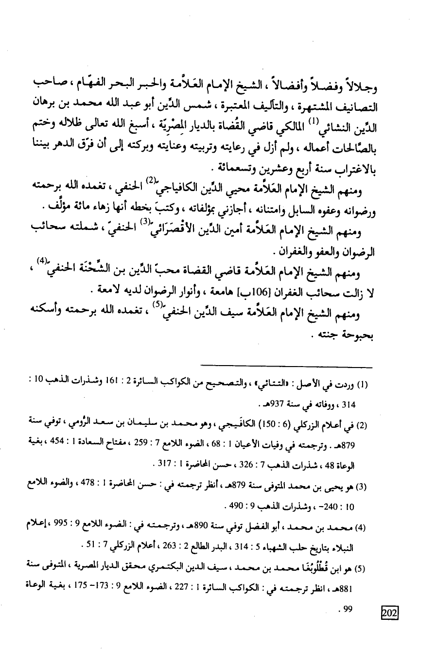 وجلالاً وفضلاً وأفضالاً، الشيخ الإمام العَلاَّمة والحبر البحر الفهّام، صاحب التصانيف المشتهرة، والتآليف المعتبرة، شمس الدِّين أبو عبد الله محمد بن برهان الدِّين النشائي المالكي قاضي القُضاة بالديار المِصْرِيّة، أسبغ الله تعالى ظلاله وختم بالصَّالحات أعماله، ولم أزل في رعايته وتربيته وعنايته وبركته إلى أن فرّق الدهر بيننا بالاغتراب سنة أربع وعشرين وتسعمائة.