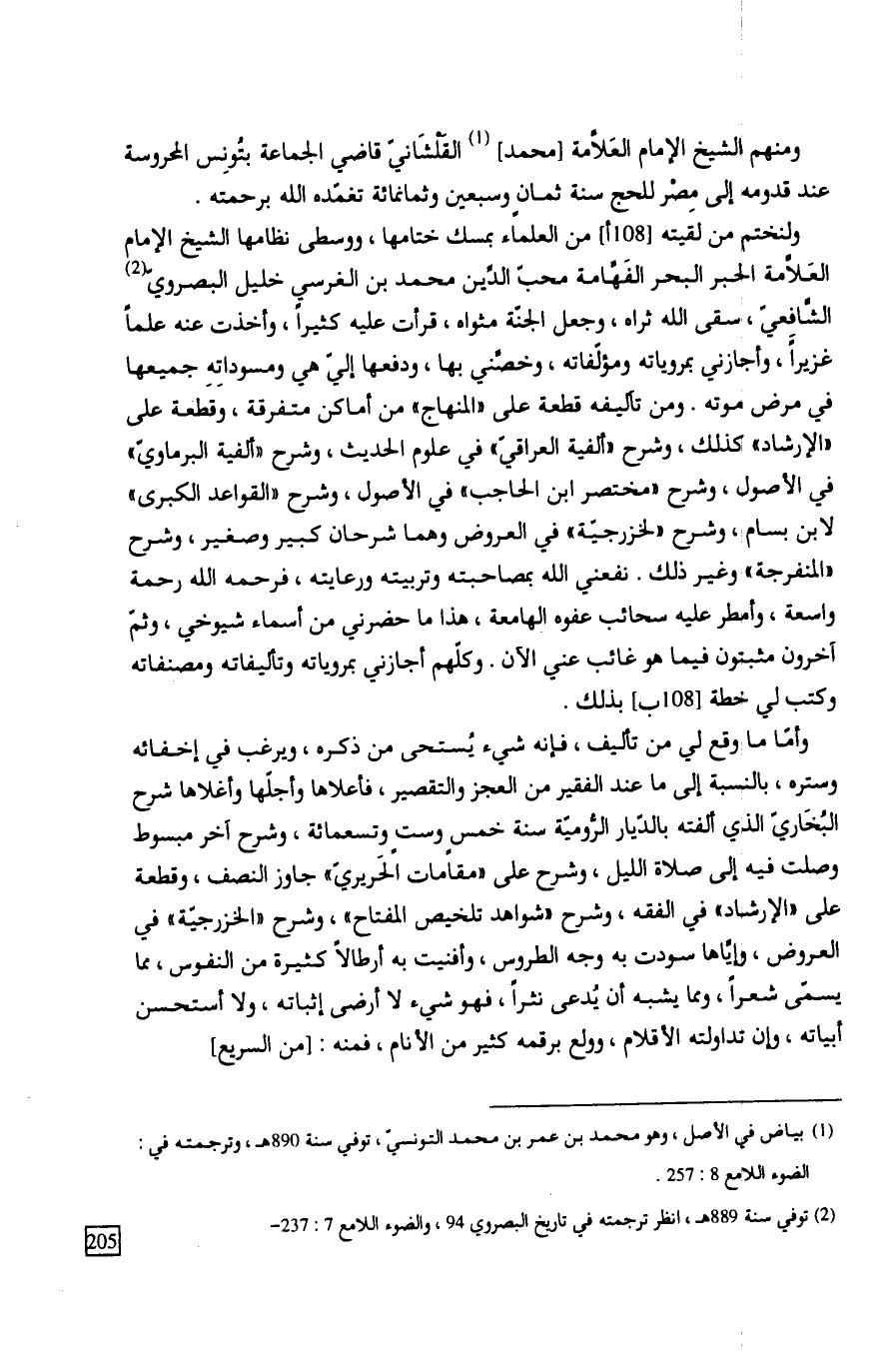ومنهم الشيخ الإمام العَلاَّمة محمد القَلْشَانيّ قاضي الجماعة بتُونِس المحروسة عند قدومه إلى مِصْر للحج سنة ثمان وسبعين وثمانمائة تغمده الله برحمته.