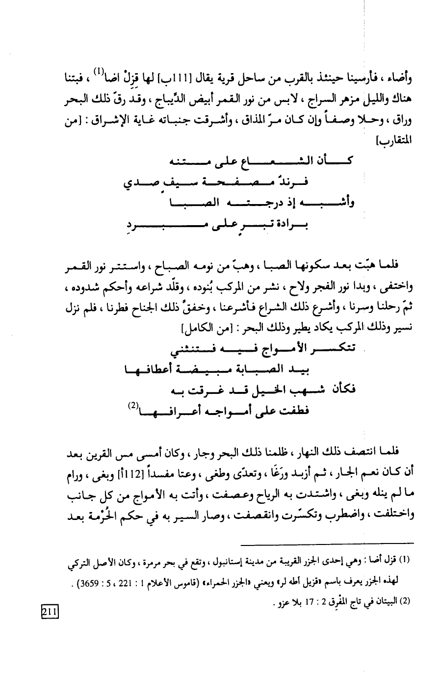 فلما هبّت بعد سكونها الصبا، وهبّ من نومه الصباح، واستتر نور القمر واختفى، وبدا نور الفجر ولاح، نشر من المركب بُنوده، وقلّد شراعه وأحكم شدوده، ثمّ رحلنا وسرنا، وأشرع ذلك الشراع فأشرعنا، وخفقَّ ذلك الجناح فطرنا، فلم نزل نسير وذلك المركب يكاد يطير وذلك البحر:
