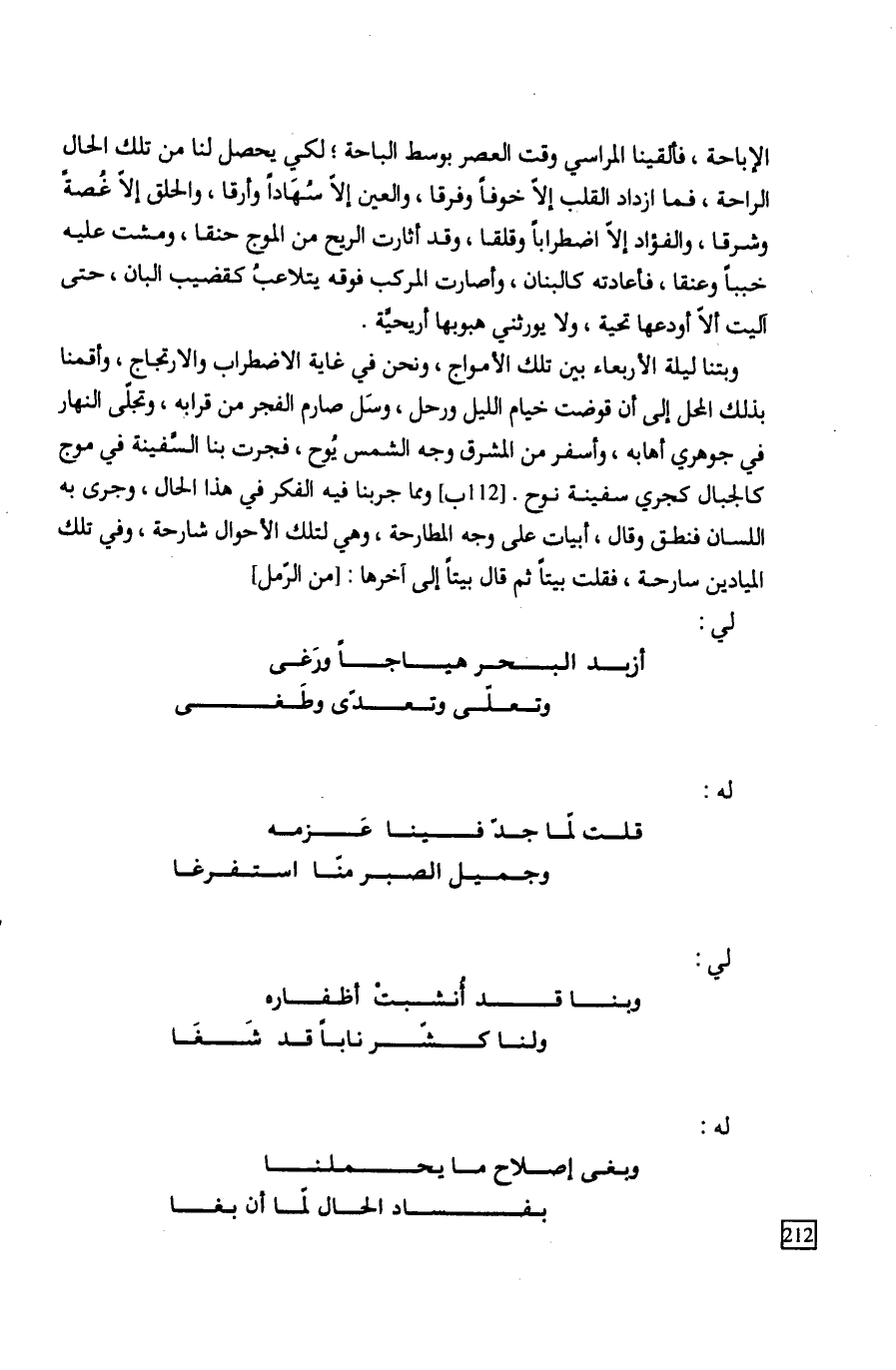 الإباحة، فألقينا المراسي وقت العصر بوسط الباحة؛ لكي يحصل لنا من تلك الحال الراحة، فما ازداد القلب إلاّ خوفاً وفرقا، والعين إلاّ سُهَاداً وأرقا، والحلق إلاّ غُصةً وشرقا، والفؤاد إلاّ اضطراباً وقلقا، وقد أثارت الريح من الموج حنقا، ومشت عليه خبباً وعنقا، فأعادته كالبنان، وأصارت المركب فوقه يتلاعبُ كقضيب البان، حتى آليت ألاّ أودعها تحية، ولا يورثني هبوبها أريحيَّة.