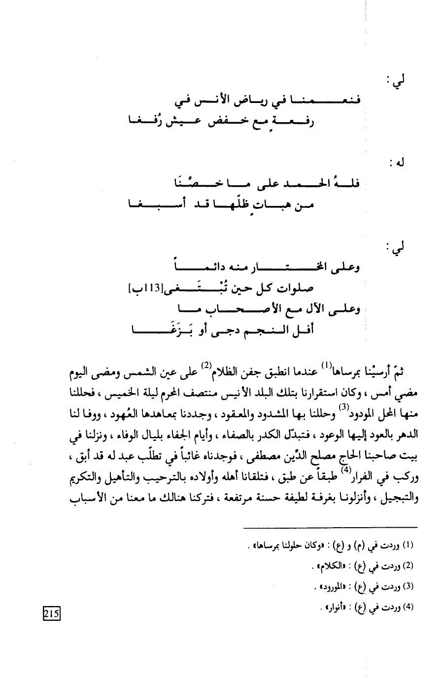 ثمّ أرسيْنا بمرساها عندما انطبق جفن الظلام على عين الشمس ومضى اليوم مضي أمس، وكان استقرارنا بتلك البلد الأنيس منتصف المحرم ليلة الخميس، فحللنا منها المحل المودود وحللنا بها المشدود والمعقود، وجددنا بمعاهدها العُهود، ووفا لنا الدهر بالعود إليها الوعود، فتبدل الكدر بالصفاء، وأيام الجفاء بليال الوفاء، ونزلنا في بيت صاحبنا الحاج مصلح الدِّين مصطفى، فوجدناه غائباً في تطلب عبد له قد أبق، وركب في الفرار طبقاً عن طبق، فتلقانا أهله وأولاده بالترحيب والتأهيل والتكريم والتبجيل، وأنزلونا بغرفة لطيفة حسنة مرتفعة، فتركنا هنالك ما معنا من الأسباب